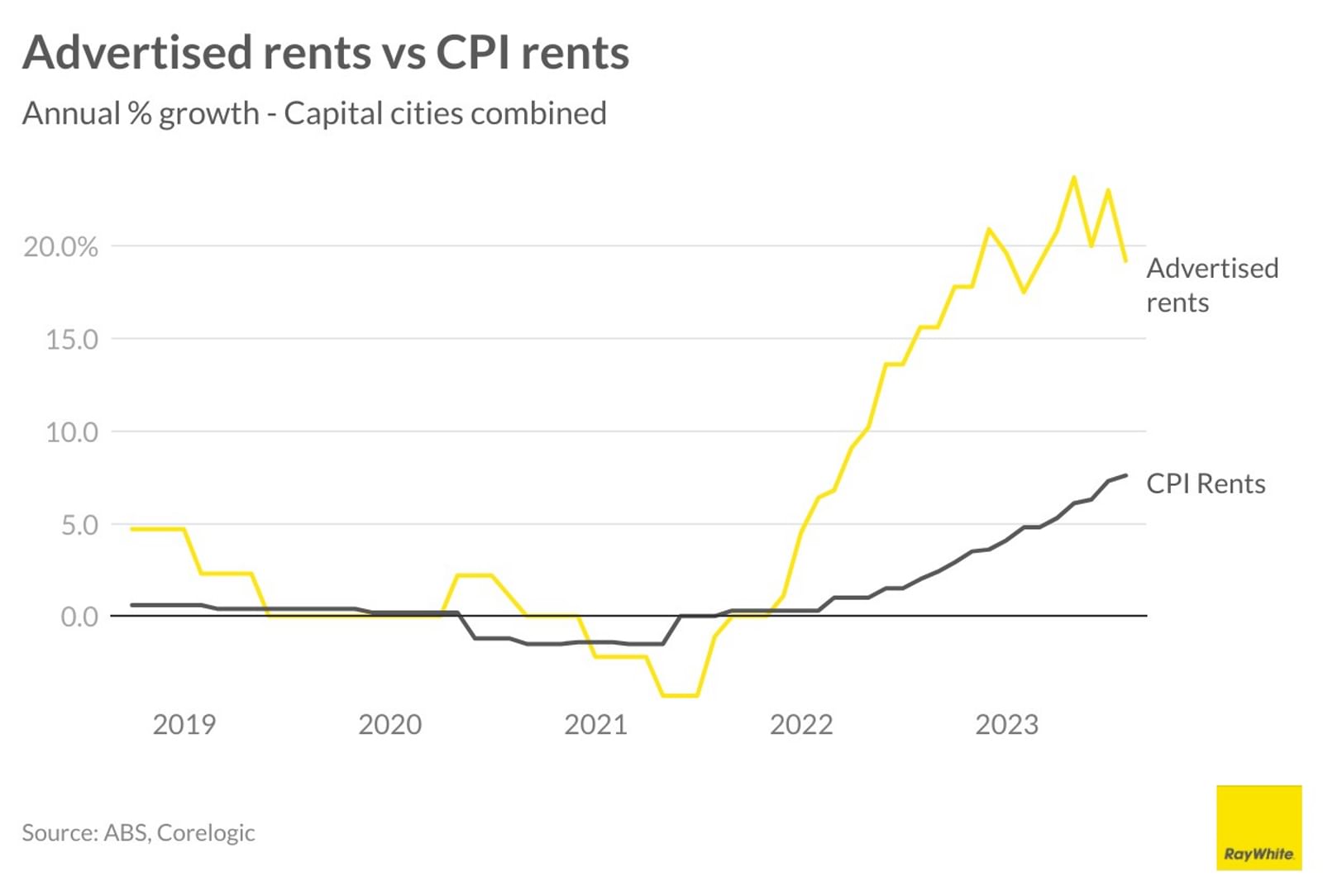 Far less positively, rents continue to increase and have some while to run. Last year, we wrote about how although advertised rents were rising very quickly, it was yet to show up in the inflation figures. This is because there is a lag between when advertised rents start to increase and the flow through to already tenanted properties. However, the converse is also true. Advertised rental growth is starting to slow but it will take some time for it to flow through to properties already rented.