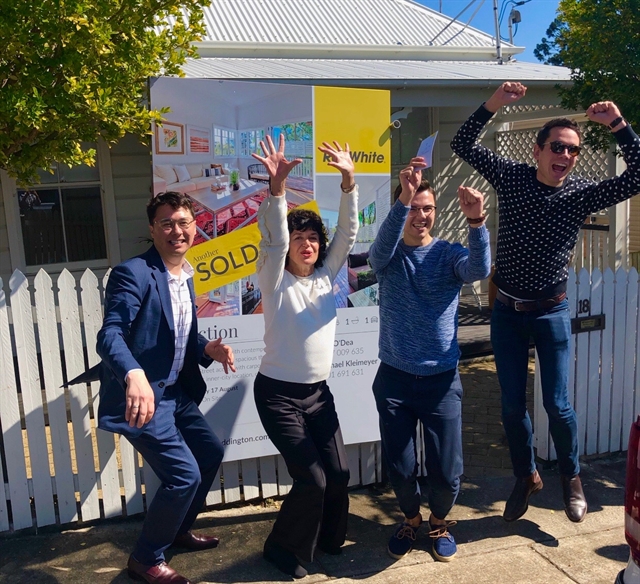 Meanwhile, in Brisbane’s leafy western suburbs, Ray White Paddington sales doyenne Judi O’Dea and co-agent Michael Kleimeyer (pictured above with their buyers) welcomed 12 registered bidders to the auction of this gorgeous renovated cottage at 18 Woolcock St, Red Hill which sold for $864,000.
