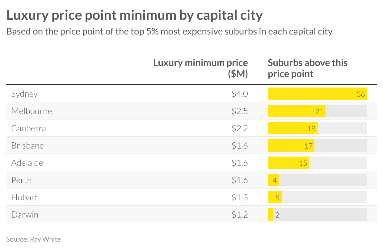 With these differences in luxury suburbs different according to location, a more consistent way is to perhaps look at the top five per cent most expensive suburbs to get a cut off point for a luxury suburb. This analysis is provided below. Based on this, a luxury home in Sydney would be priced above $4 million while in Melbourne that reduces to $2.5 million.