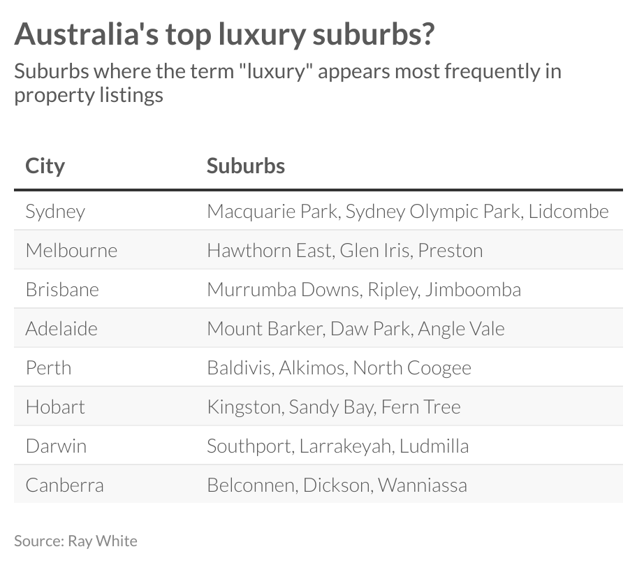 Another way would be to look at how luxury homes are described when they’re up for sale. Some of the suburbs that most frequently have the word “luxury” in their description are not priced within the luxury price thresholds outlined above. In Sydney, the suburb of Macquarie Park came up as most frequently having the word “luxury” in property listings. While there’s a lot of new development, it isn’t typically seen as a luxury suburb. This is also the case for Angle Vale in Adelaide and Baldivis in Perth. Meanwhile, some suburbs where we see the term “luxury” are considered higher end suburbs. These include Hawthorn East in Melbourne and Sandy Bay in Hobart.