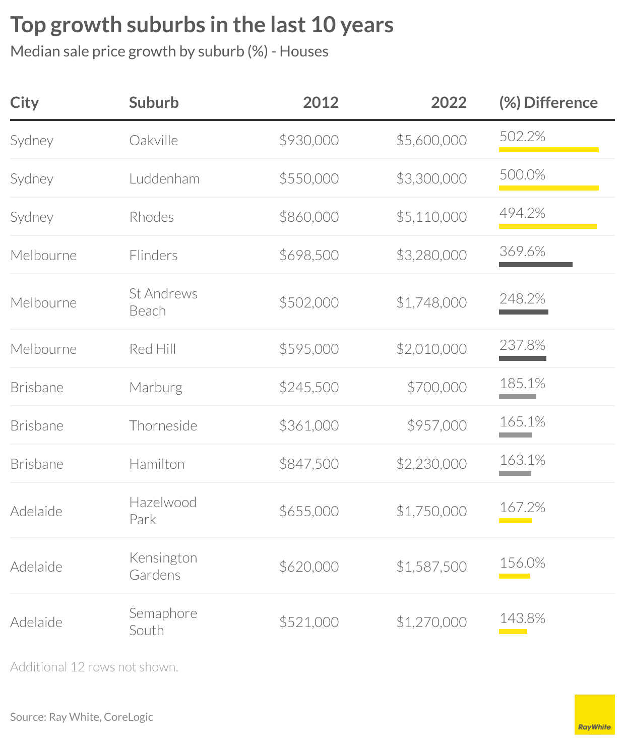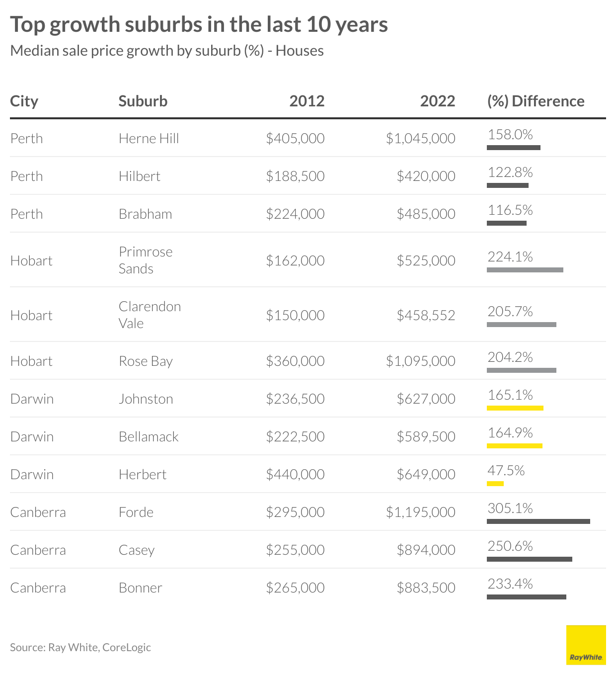 The medians of each capital city have in fact, at least, doubled. Although Darwin saw the lowest amount of growth, its median still increased from $269,000 to $550,000. At an aggregate level, it’s held that property prices more than double every 10 years. Once you get to suburb level, there are many suburbs that have seen even higher growth.