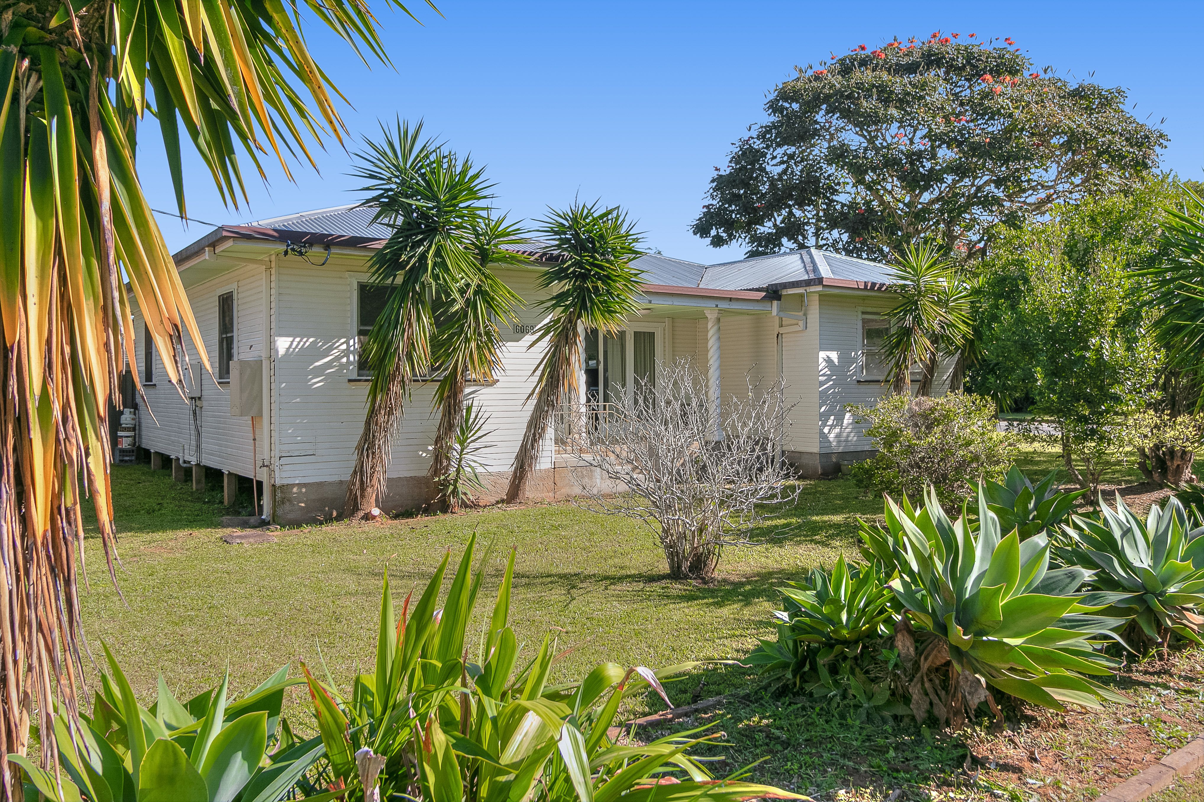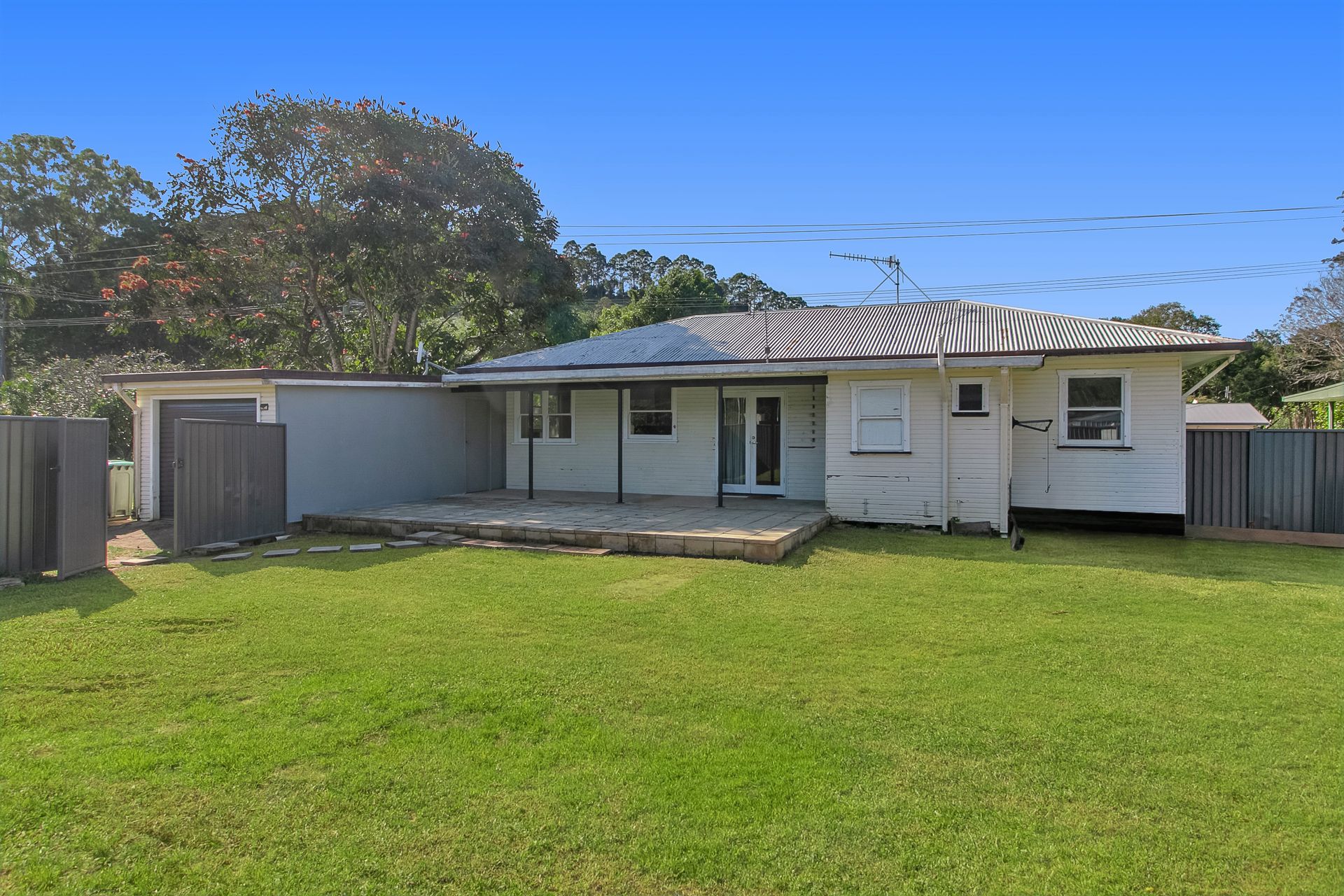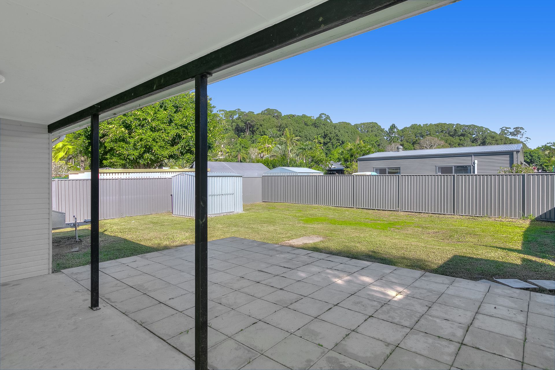 - A large flat yard with a garden shed in a fully fenced area.