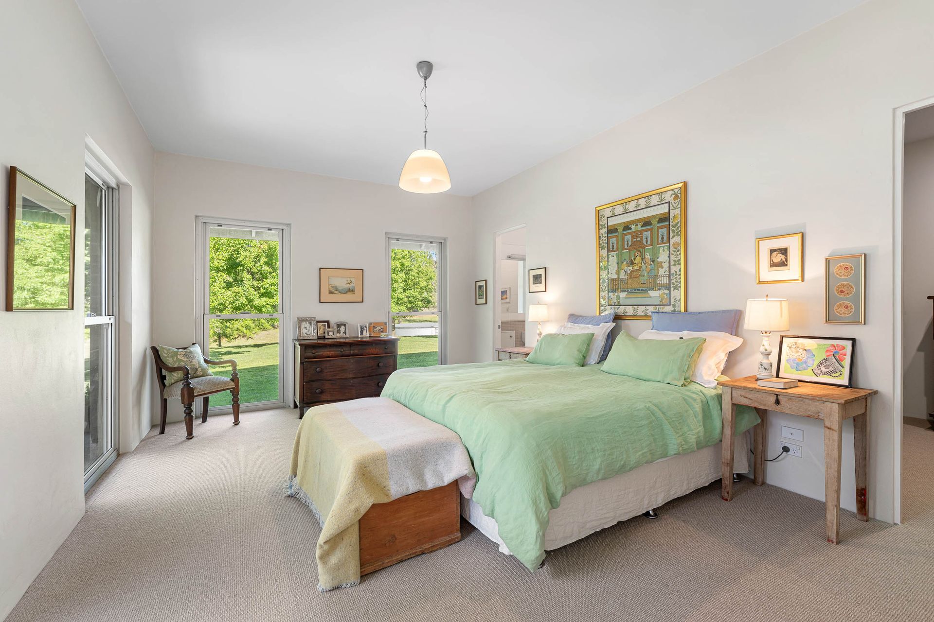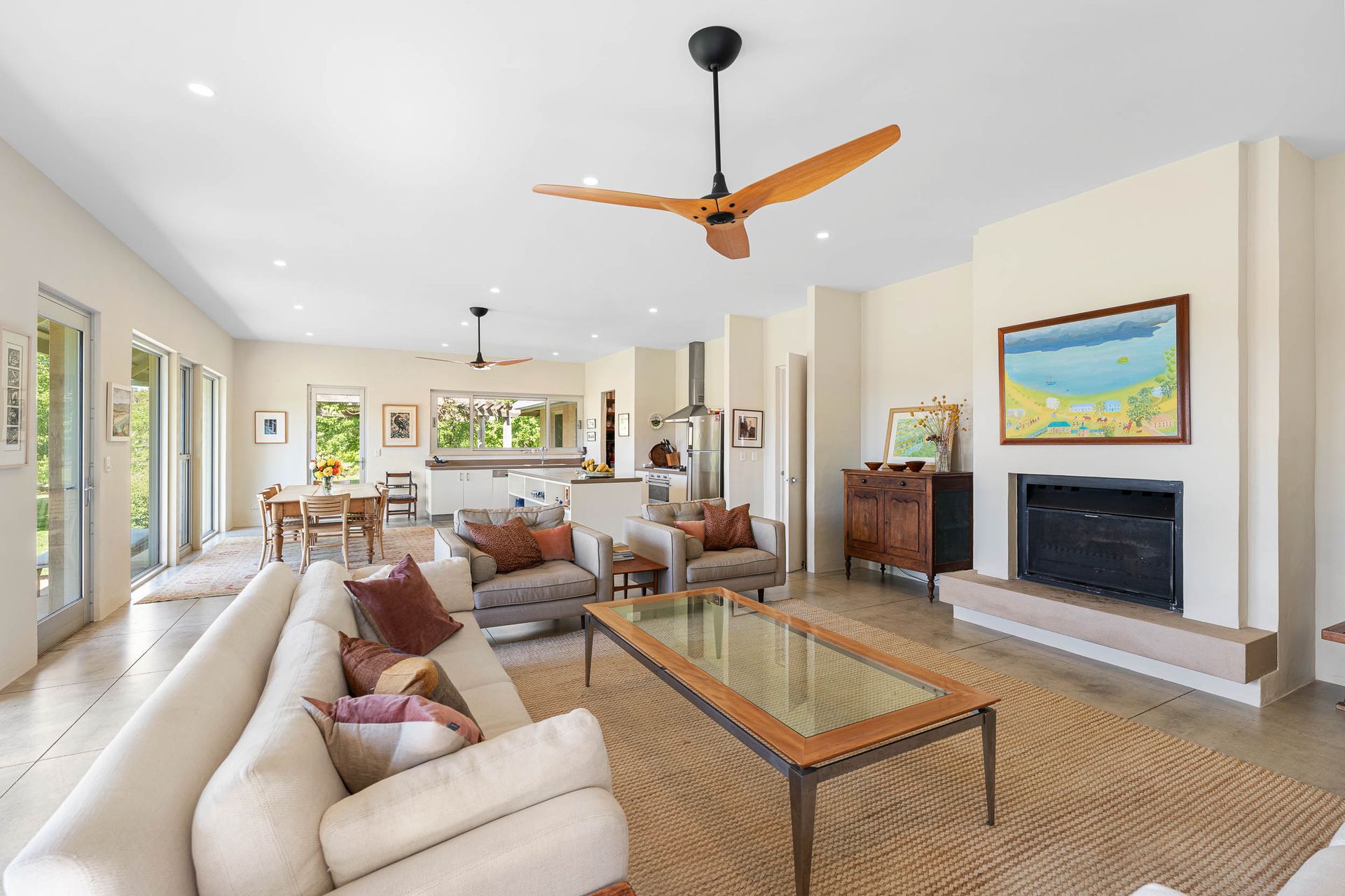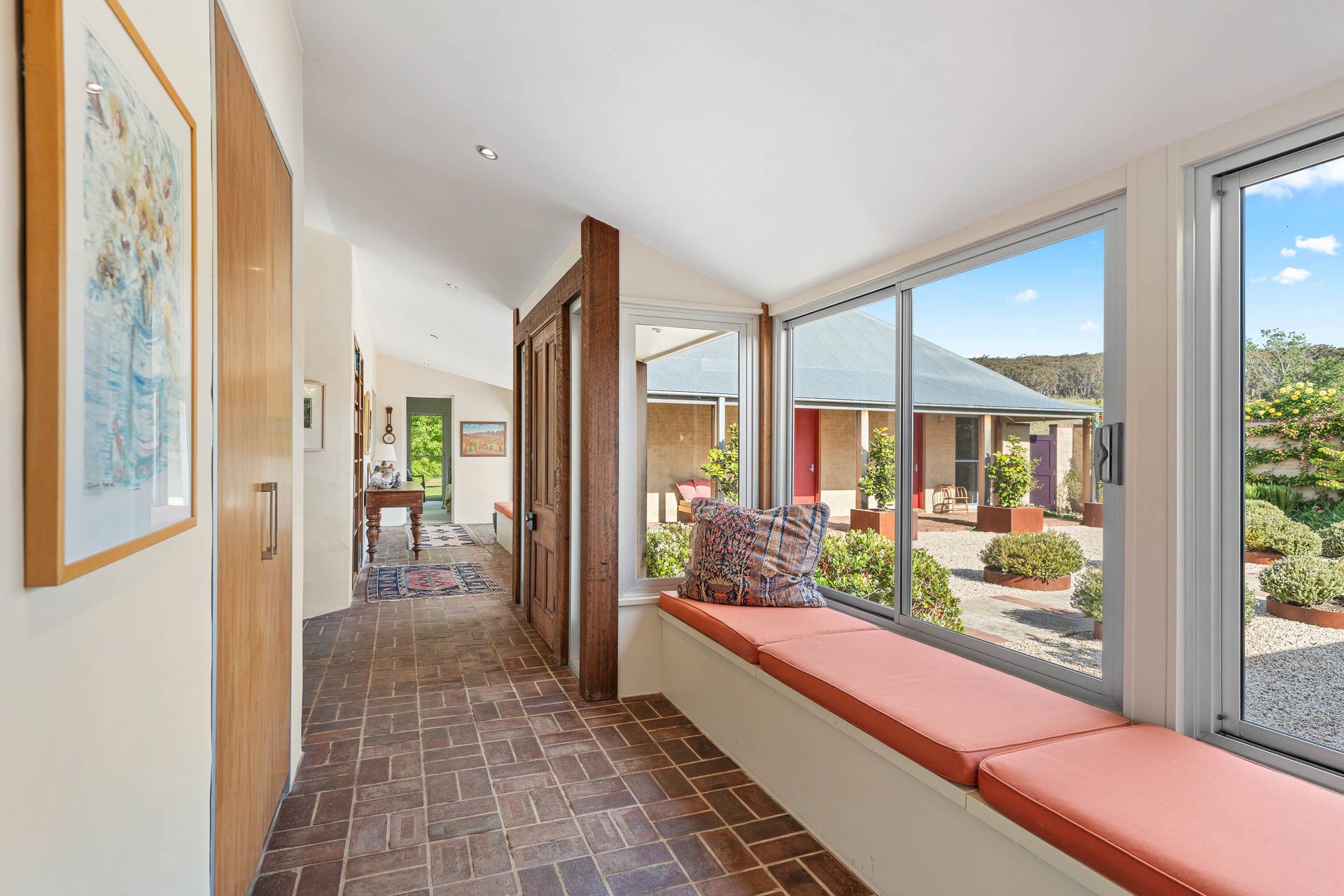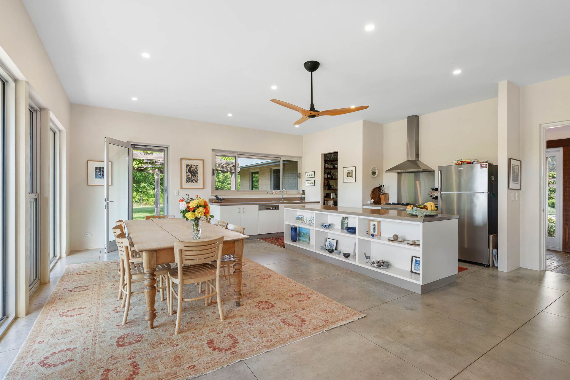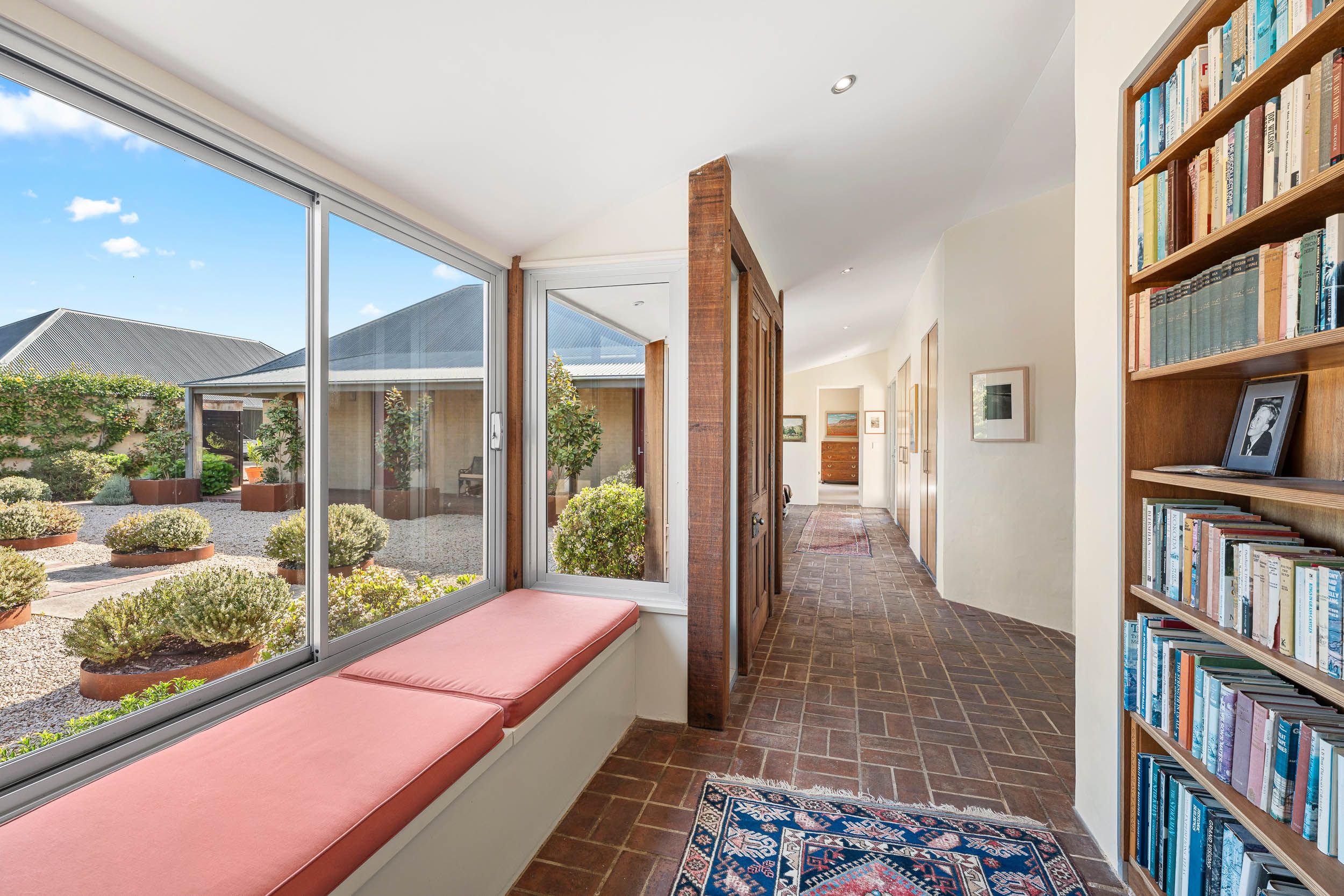 Inside, the thoughtful layout unfolds across three pavilions - each designed to celebrate space, light and connection to the landscape. The main living pavilion features 3-metre ceilings, double-glazed windows and polished concrete floors that soak up the winter sun, ensuring year-round comfort. Expansive glass doors open to a series of seasonal courtyards and verandahs, inviting seamless indoor-outdoor living and creating perfect spaces for entertaining.