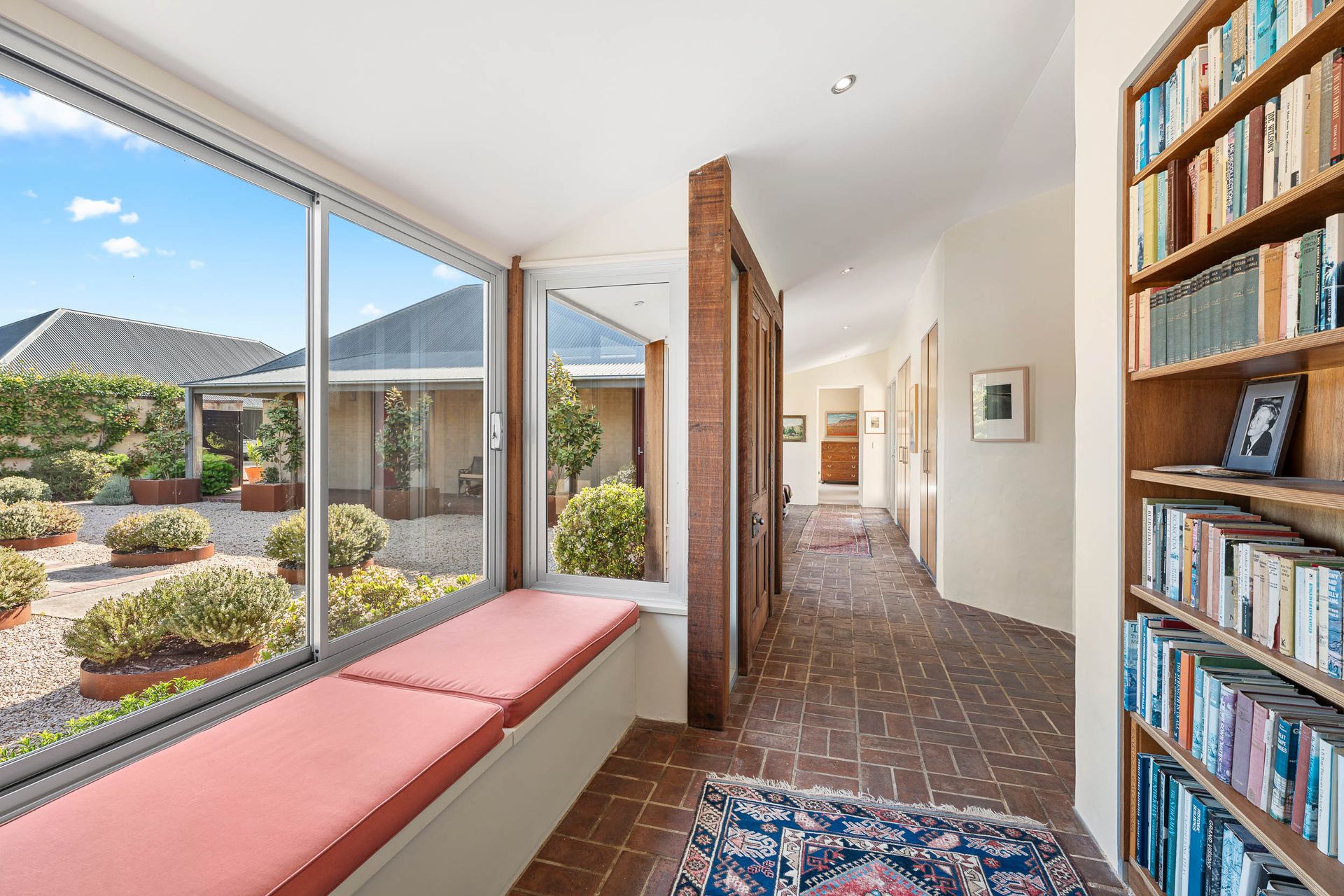 There are four bedrooms - three with walk-in robes - and three bathrooms, including a generous master suite that looks onto a north facing courtyard. The long gallery-style hallway with views to the internal courtyard offers space for art or quiet reflection, while a separate rumpus room provides flexibility for family living.