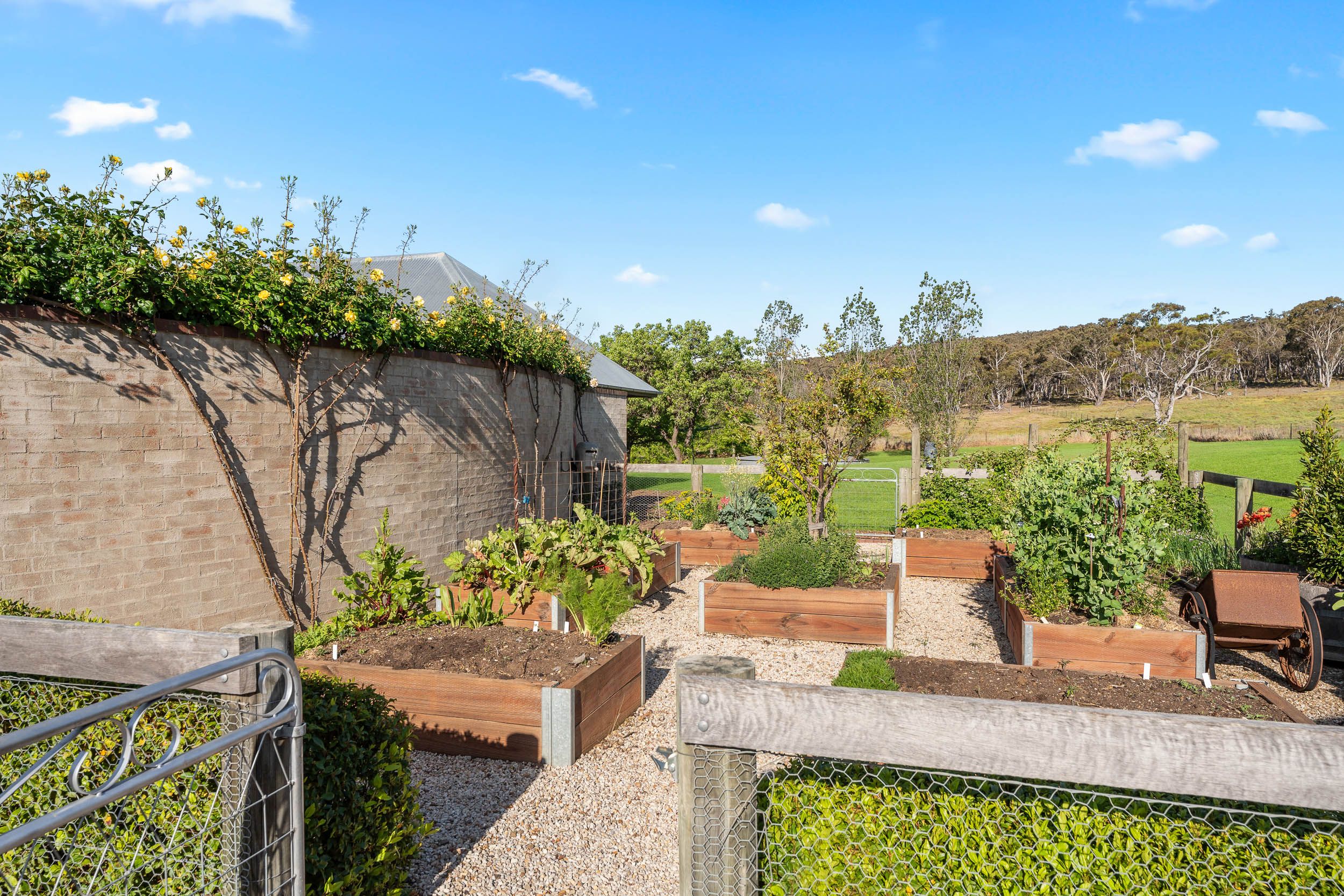 Practical features include in-slab heating, ceiling fans, double brick construction, a 104,000-litre rainwater tank, bore water, and an automatic lawn irrigation system. The impressive garage and shed complex provides excellent storage, a home office, studio, and workshop. The garden is fully fenced and includes a chook yard and adjoining paddock - ideal for those with pets or hobby farm interests.