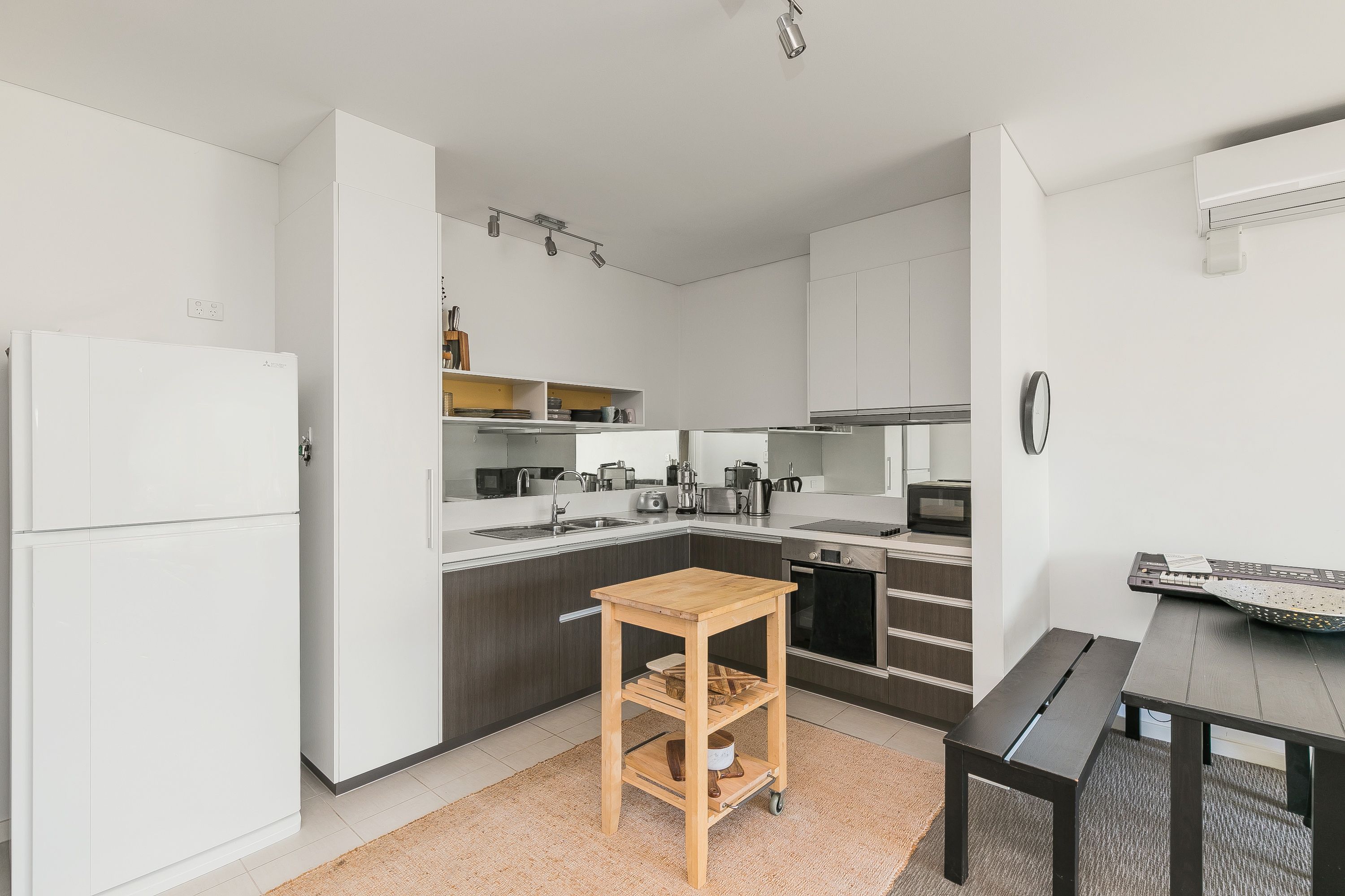 Modern kitchen with electric cooking and ample cupboard/benchtop/storage