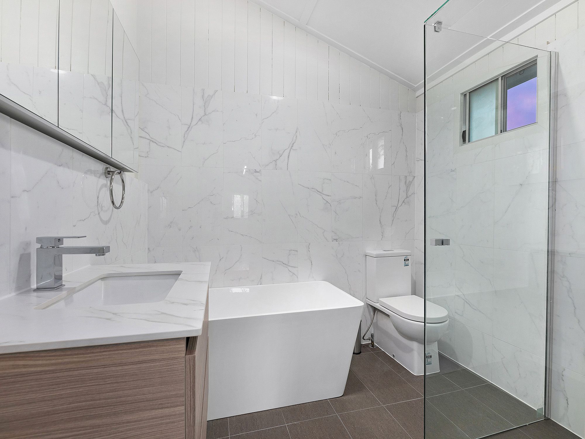 - Modern bathroom with shower, luxe free-standing bath and classic marble look tiles