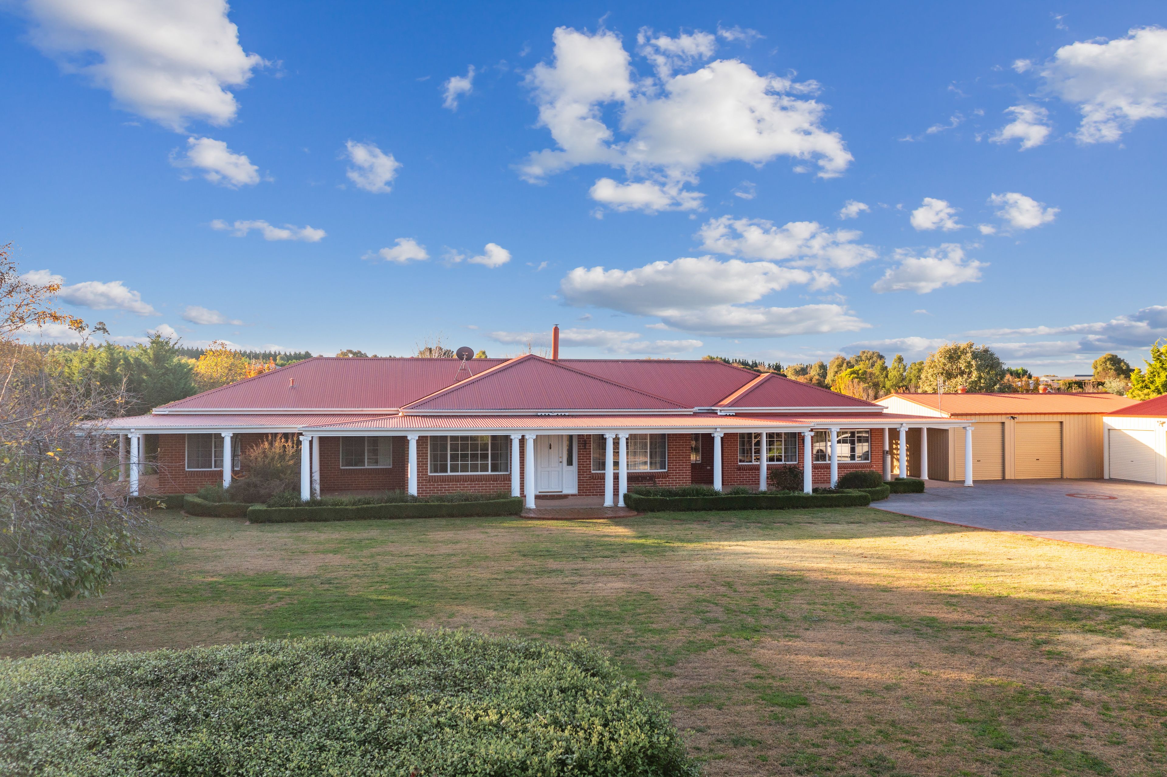 From entry into the property via the curved, tree-lined driveway, you are met with the large brick home featuring a wide, homestead inspired verandah that wraps around the house and leads out to expansive lawns and gardens.