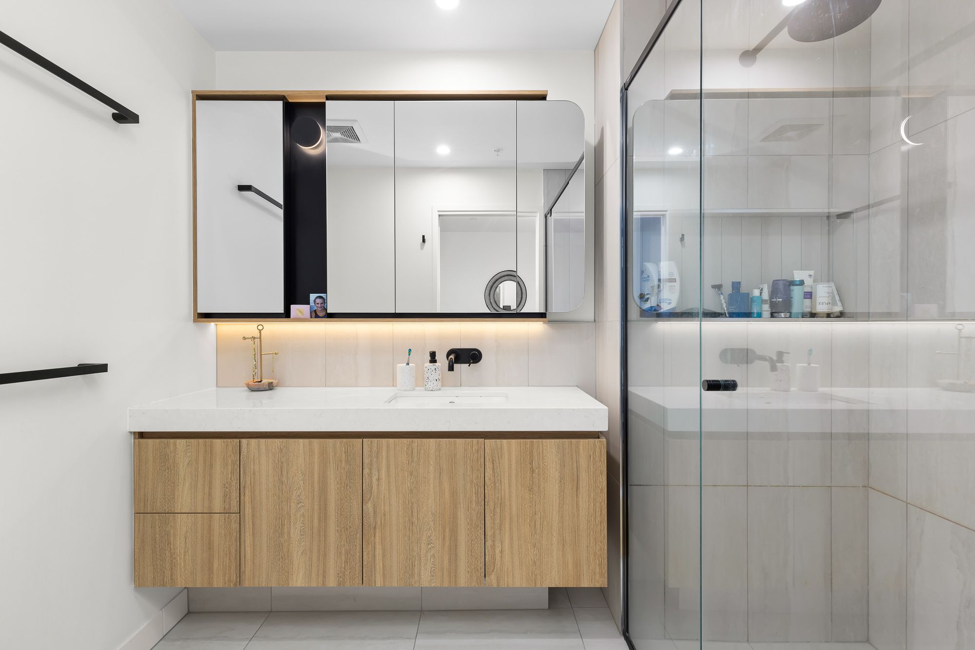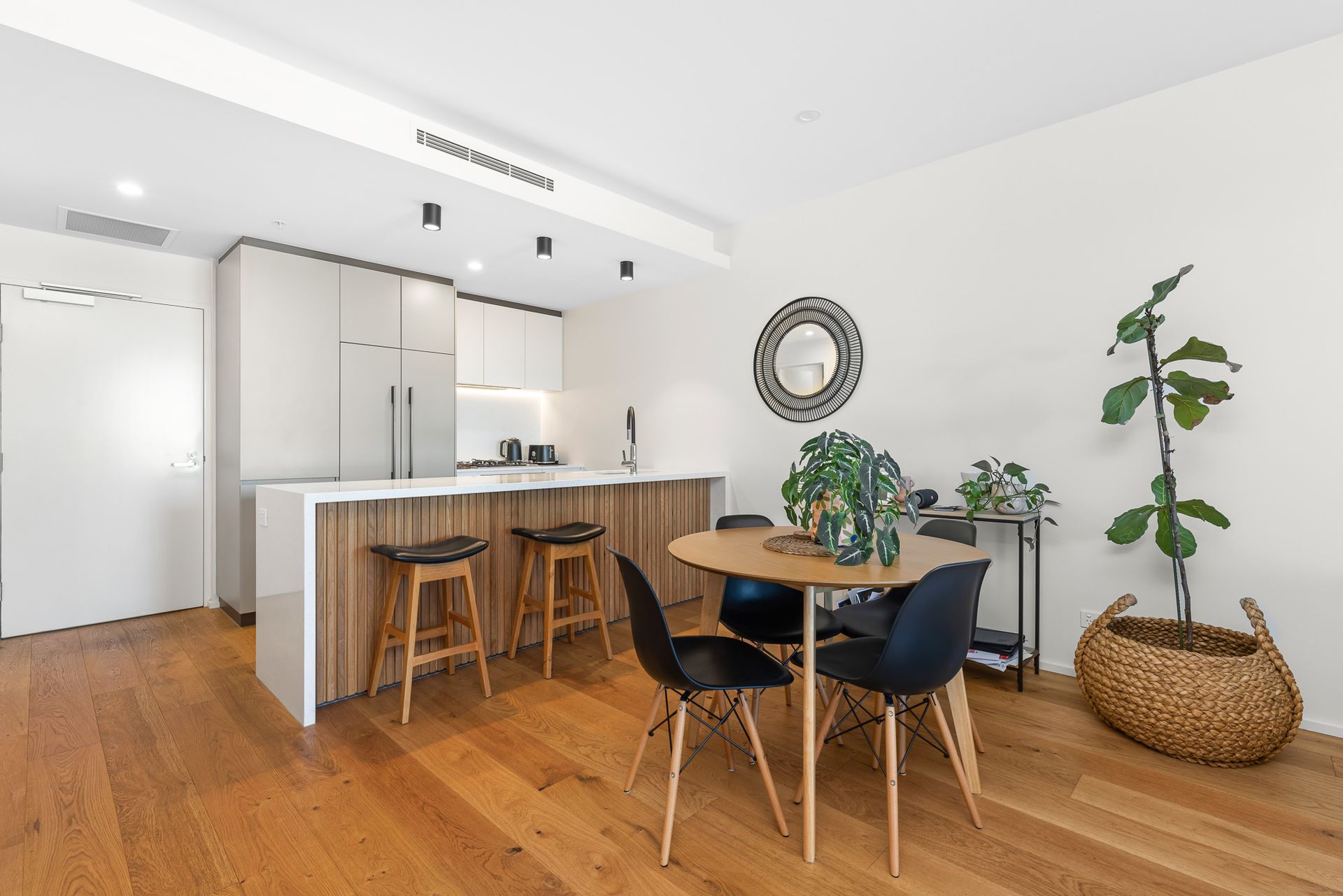 • Contemporary kitchen boasting stone bench tops, premium appliances including integrated fridge, dishwasher and microwave, and plenty of storage space.