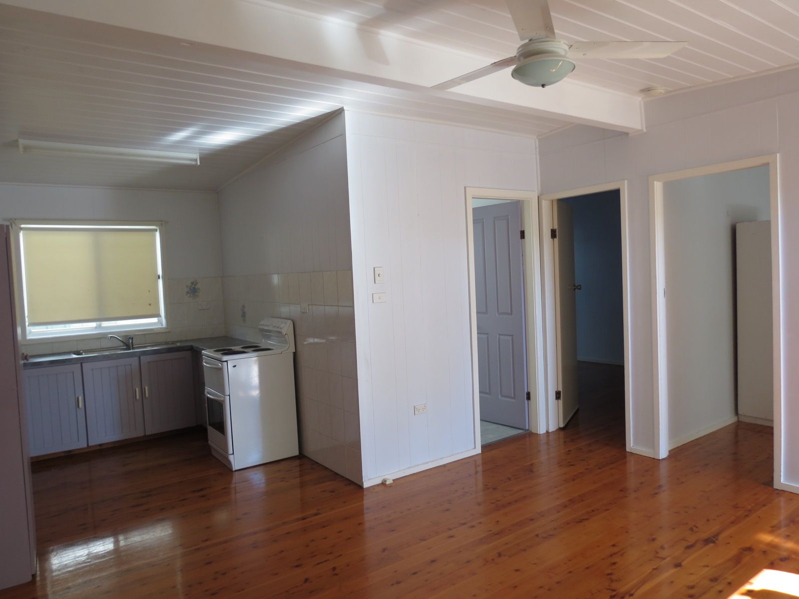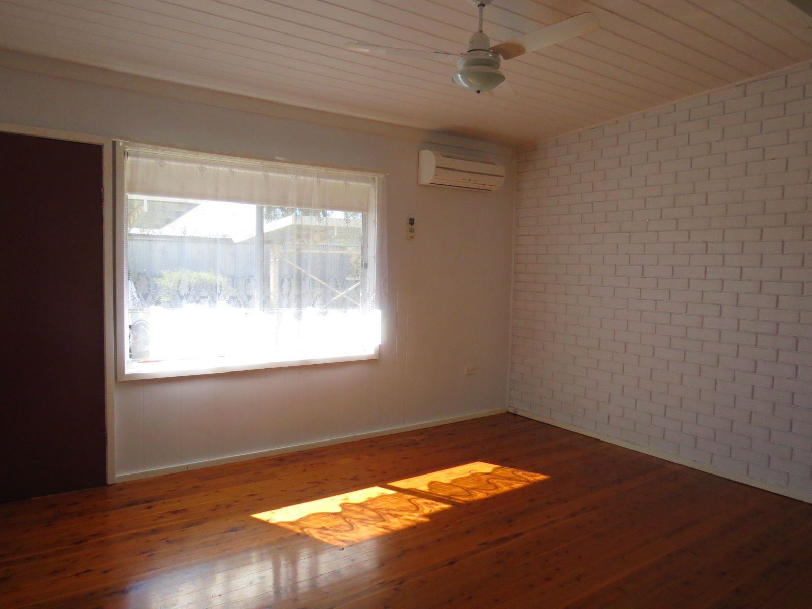 Open plan dining and kitchen area with split system ac.