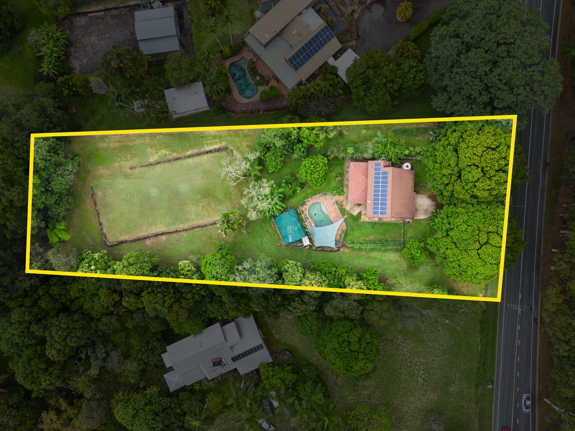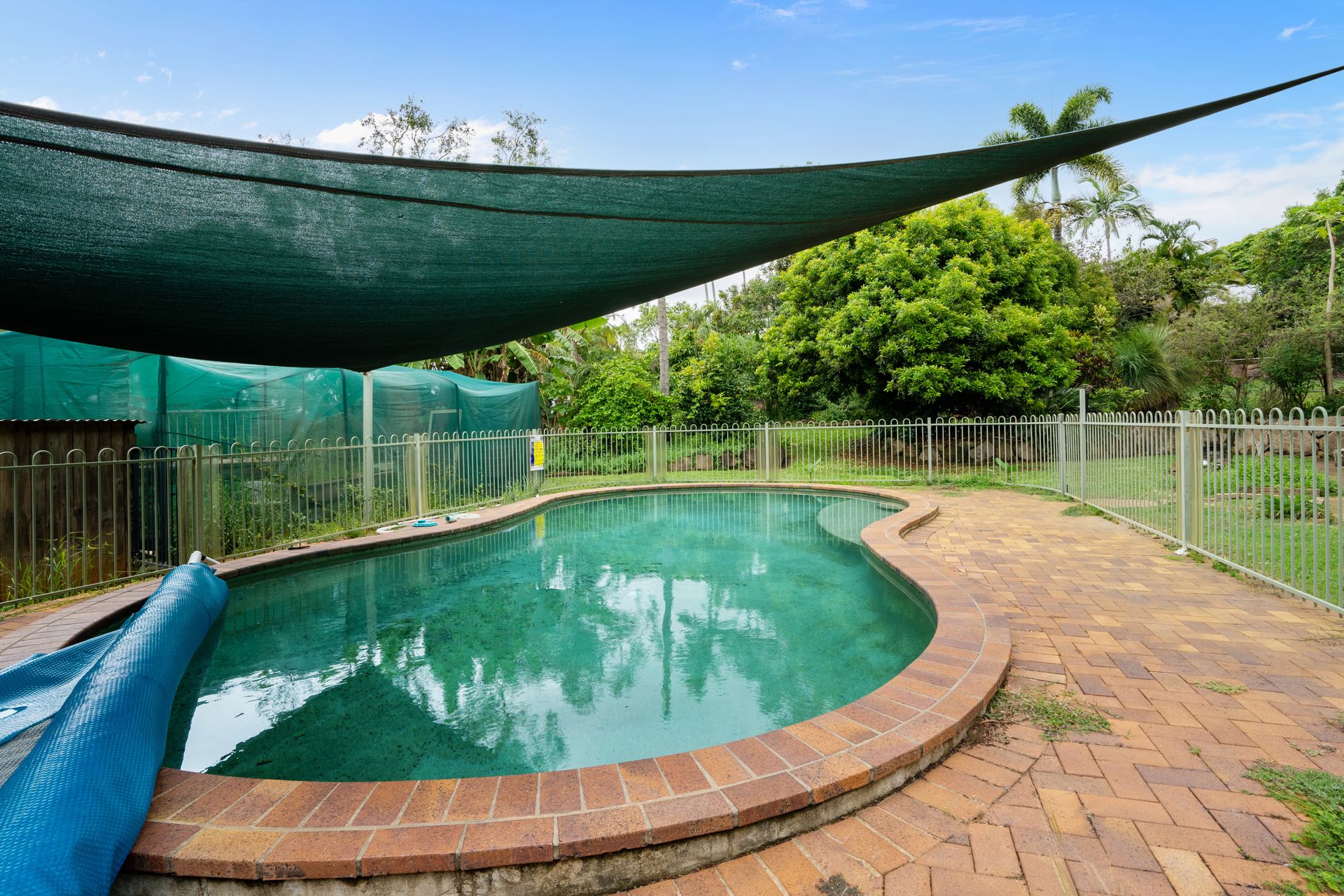 *A fully fenced backyard features a generously sized pool perfect for the summer months, a greenhouse, and a huge undercover entertainment area