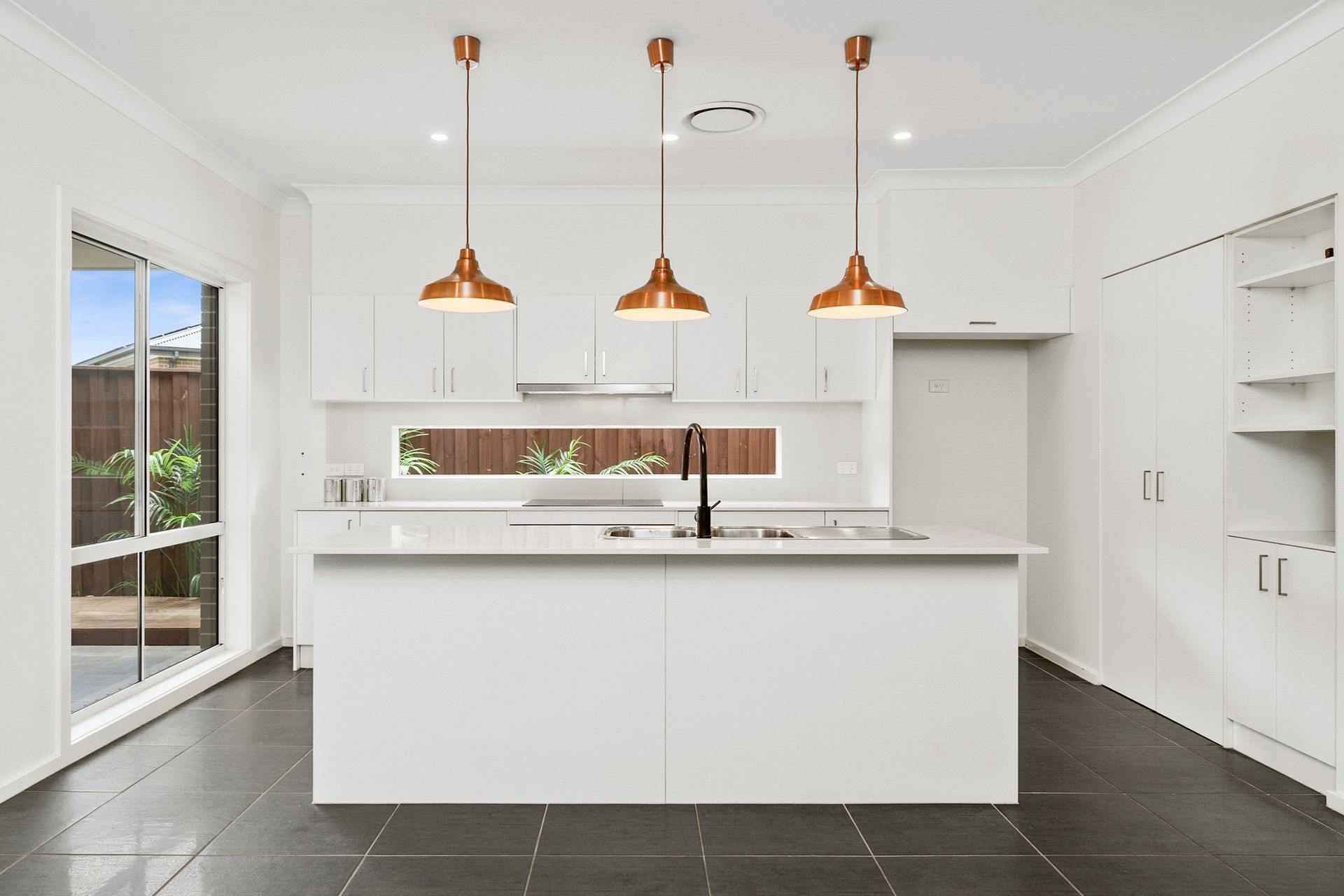 • Kitchen with 20mm stone benchtops, 900mm cooktop and oven, island bench with breakfast bar and pendant lighting, dishwasher and walk in pantry