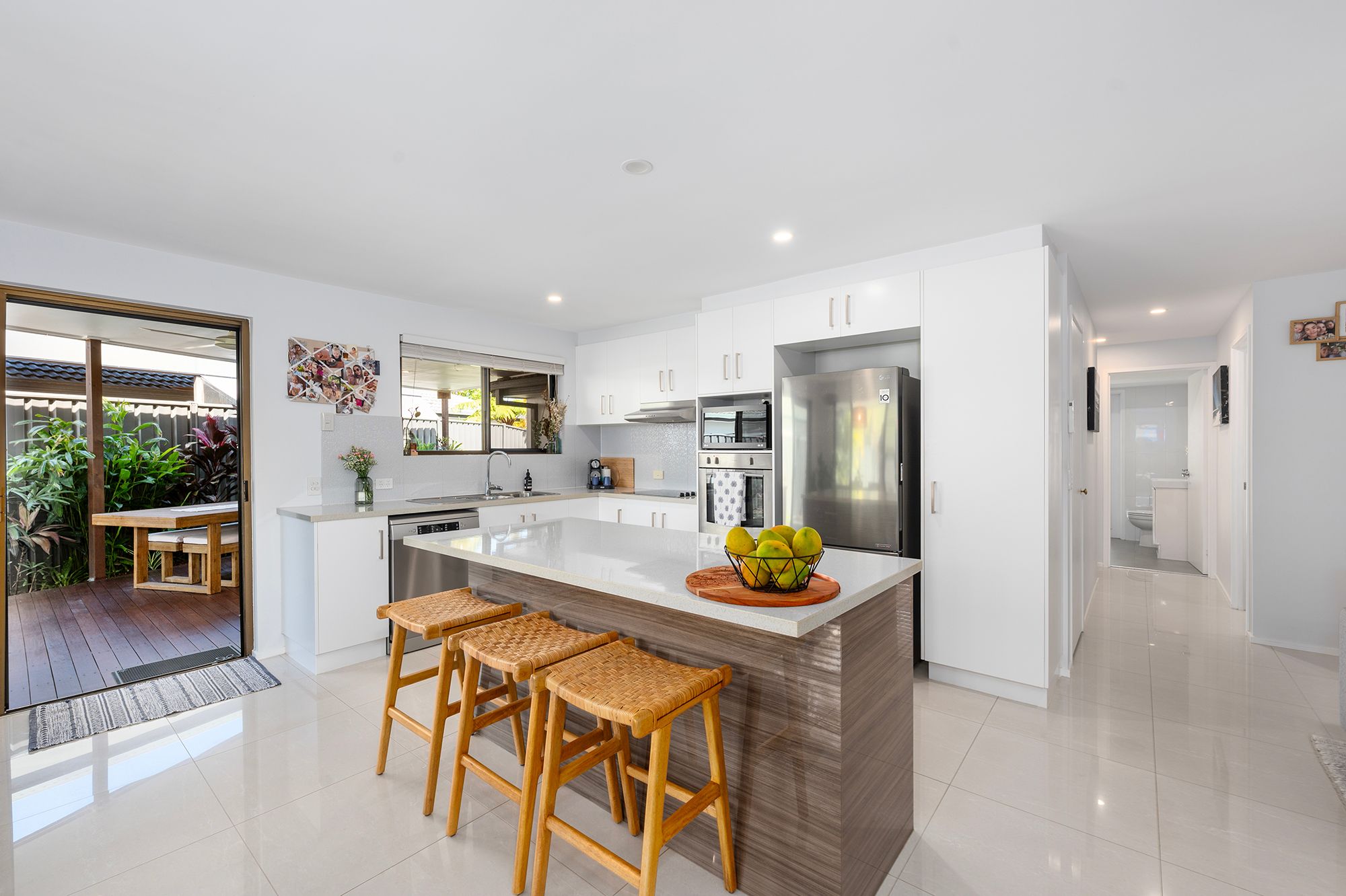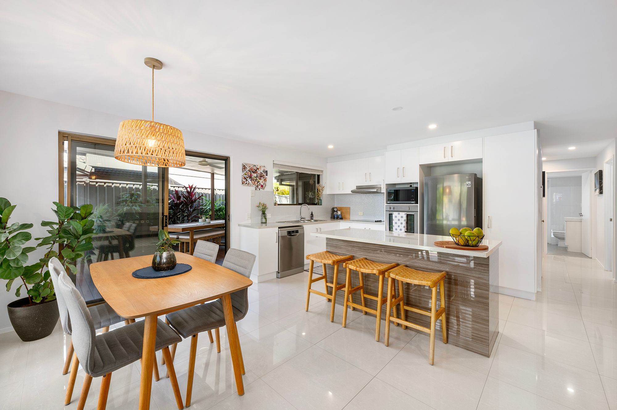 Step inside to embrace the harmonious blend of the open-plan kitchen, dining, and living spaces. The kitchen boasts an inviting island bench, gleaming stainless steel appliances, ample drawers, and storage, all overlooking the inviting alfresco area. The dining area captivates with a striking pendant light and picturesque views of meticulously manicured gardens.