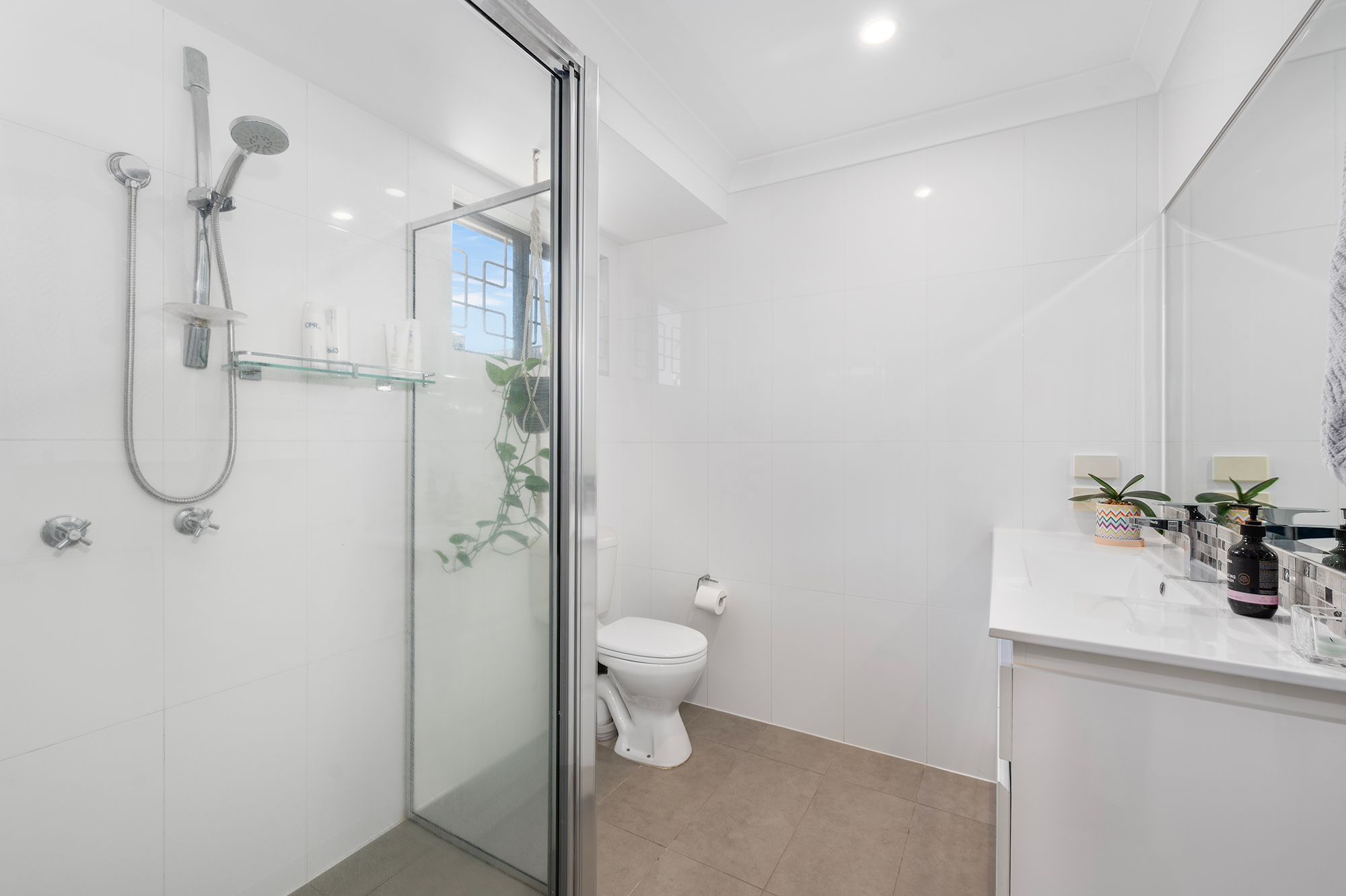 The main bathroom seamlessly combines functionality and style, serving as both a bathroom and laundry space, complete with a shower, vanity, and toilet.