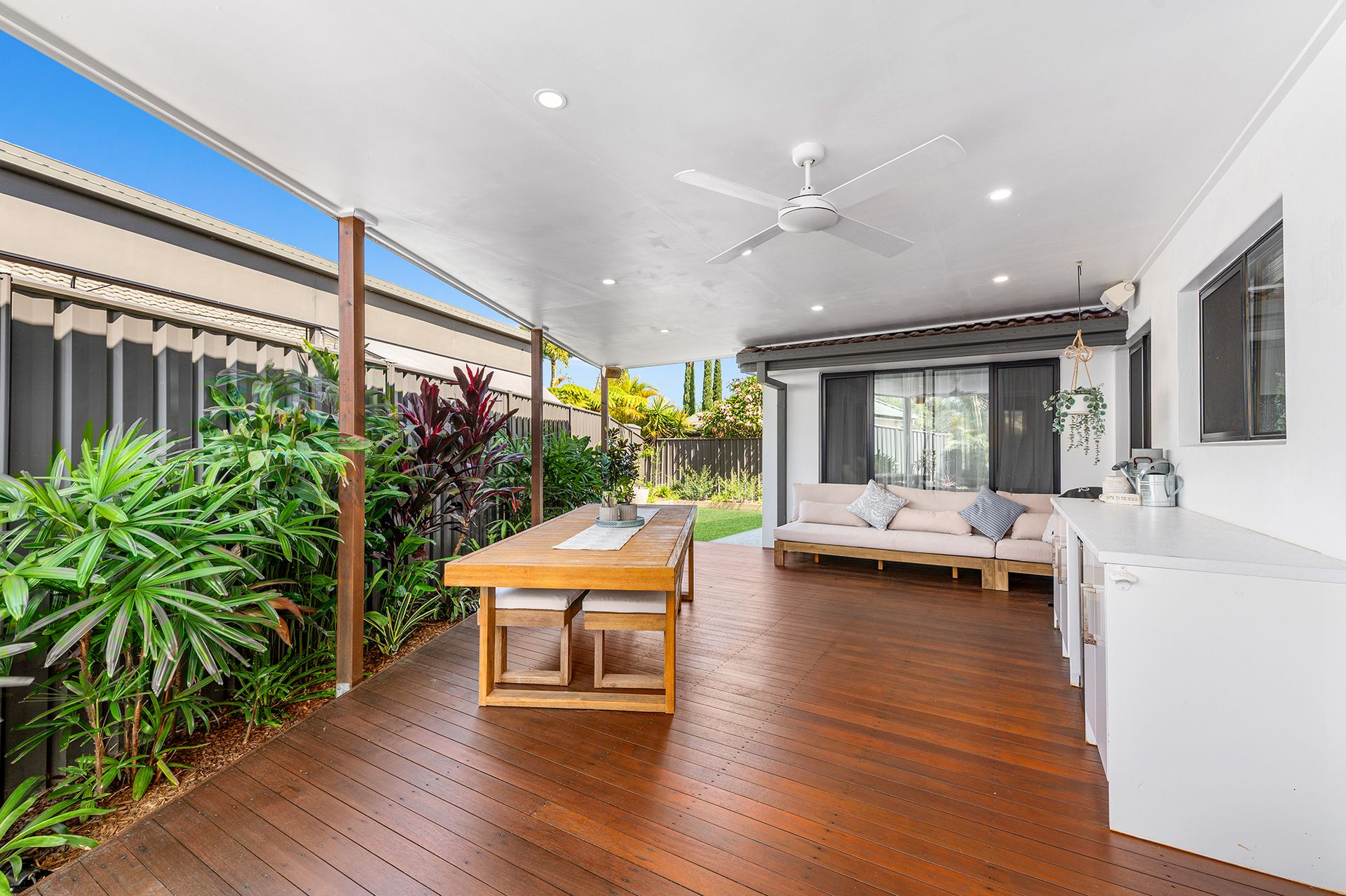 Step outside to the inviting alfresco haven with high ceilings, a refreshing fan, a wooden deck, a convenient bench, and a designated refrigerator nook. The manicured gardens unfold in a delightful mix of grassed areas, paved paths, and exposed cement. Additional features include a garden shed, a custom-made cover for the hot water system, and high fencing for utmost privacy.