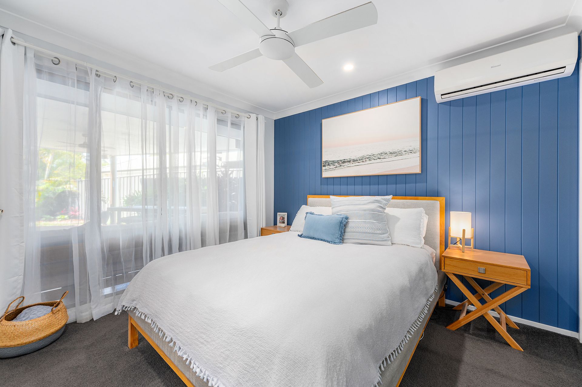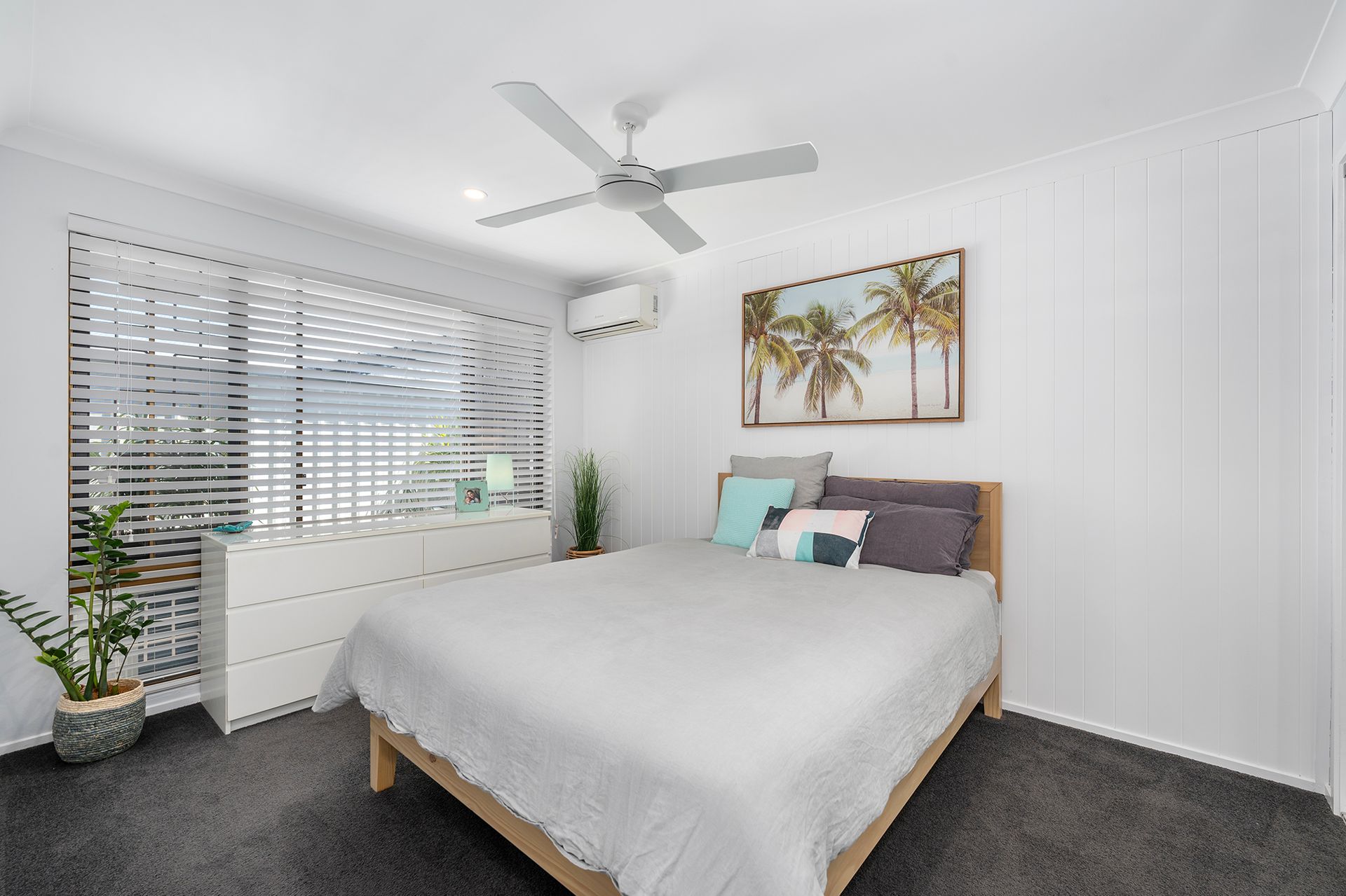 The master bedroom is a sanctuary of comfort, featuring built-in mirrored wardrobes, a soothing ceiling fan, split-system air conditioning, and a chic ensuite with shower, toilet, and vanity. VJ paneling adds a touch of elegance to the space.