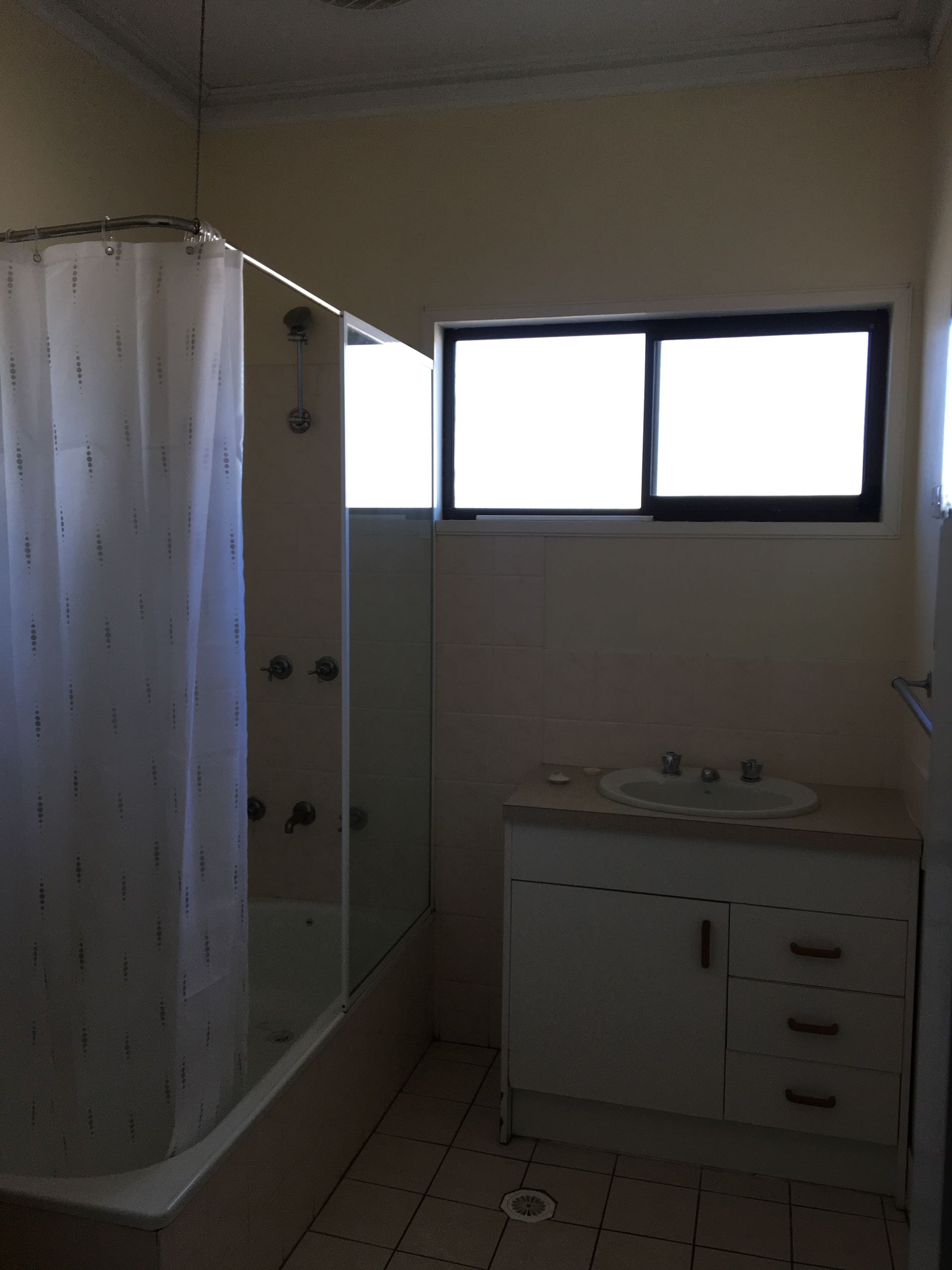 - Separate bathroom with shower over bath.