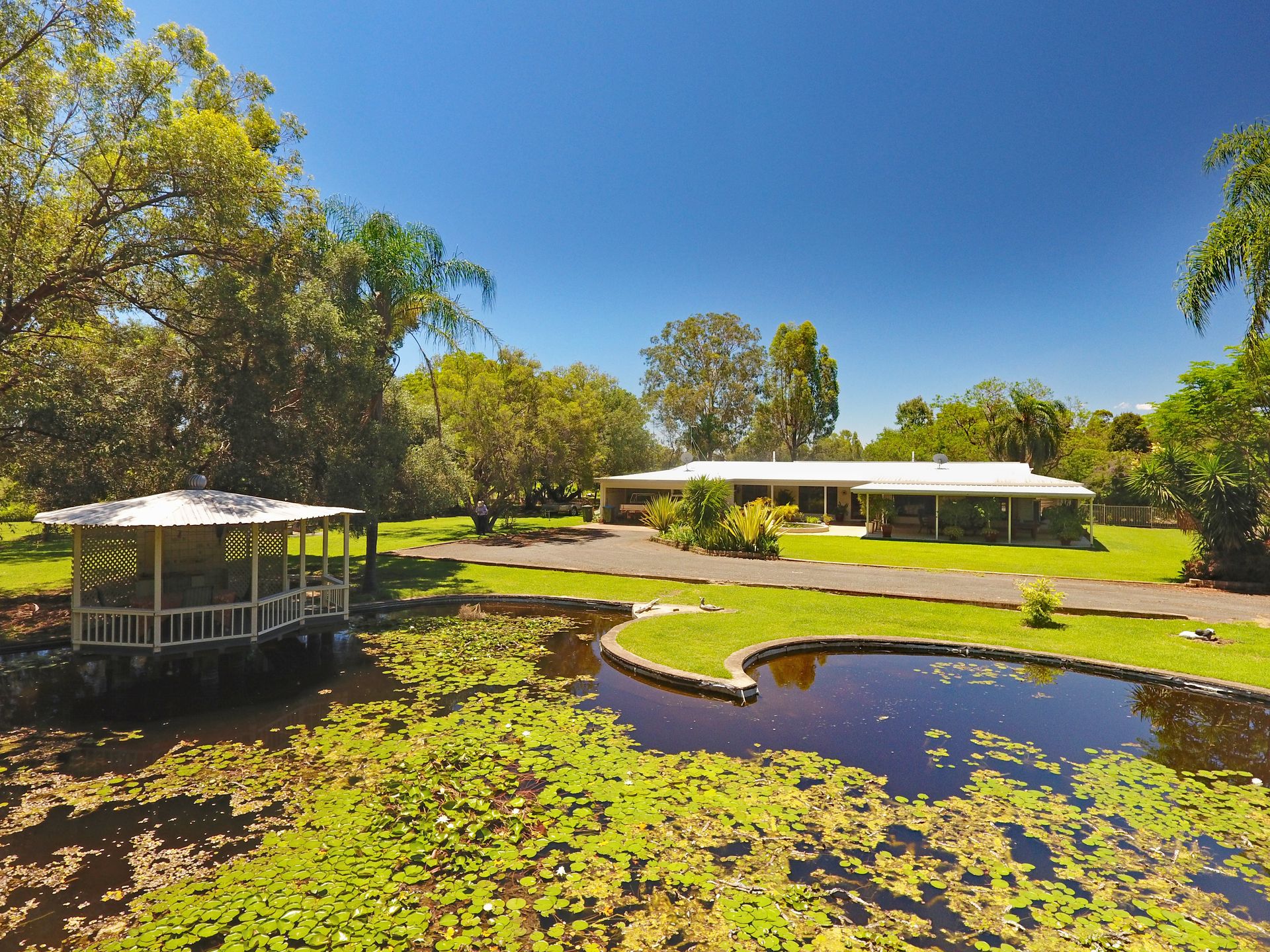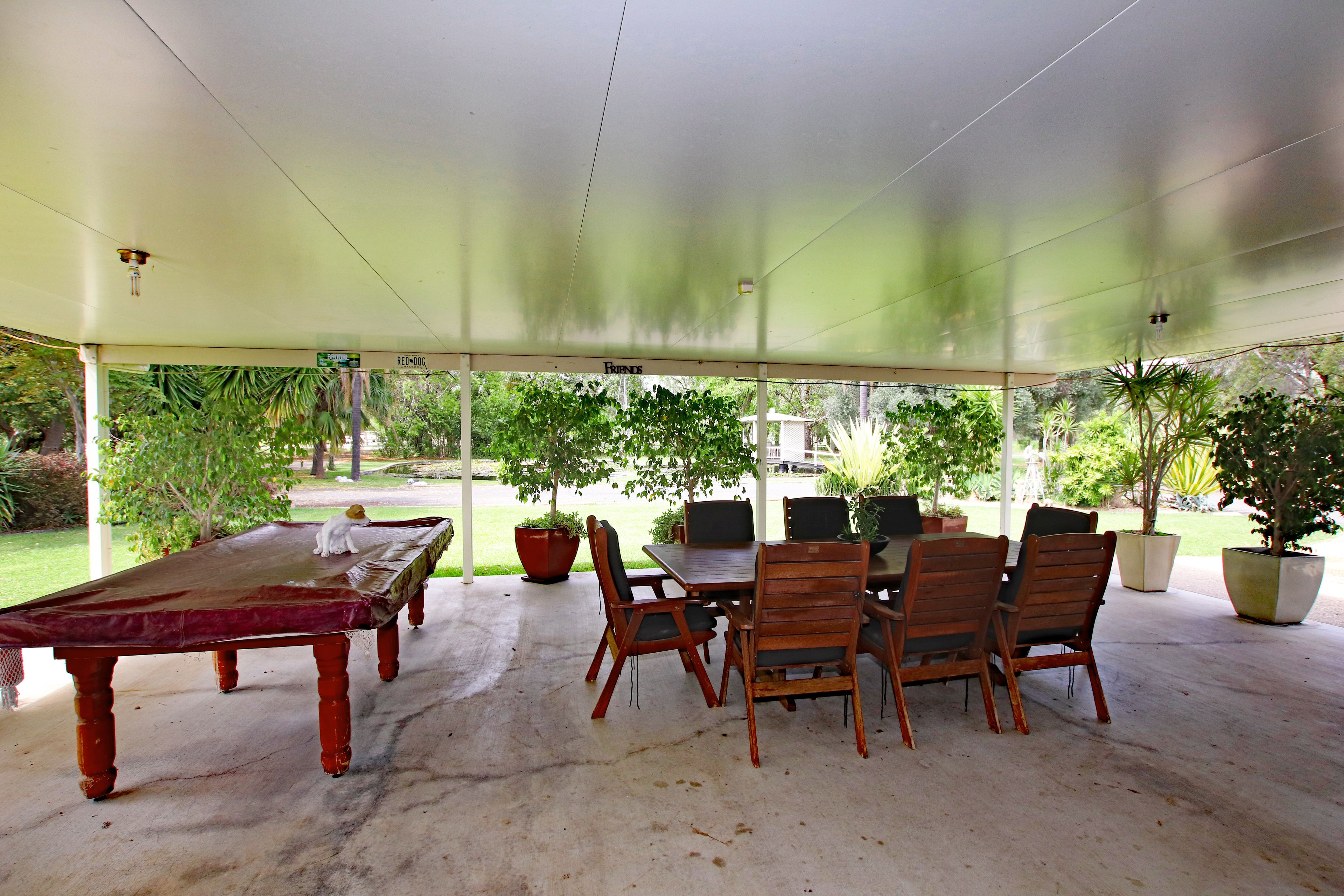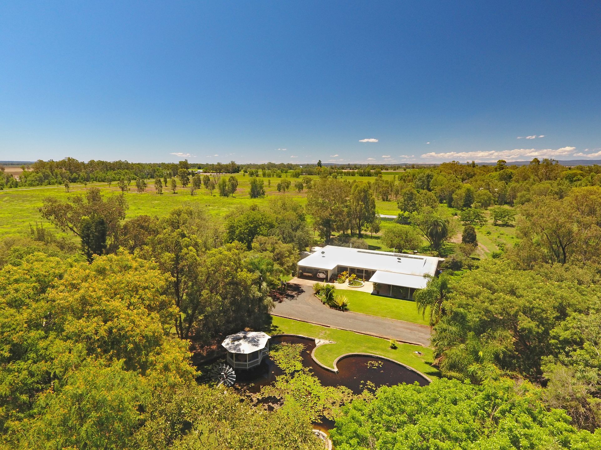 The lowset residence with views across the adjoining farmland and out to Mt Murchison is set amongst spacious lawns and established gardens. A large concrete lined pond is stocked with native fish and covered with water lilies. A gazebo overlooks the pond and is perfect for entertaining with friends or relaxing and enjoying the peace and quiet. For the larger family gatherings, the covered 10 metre x 6 metre entertainment area is just perfect.
