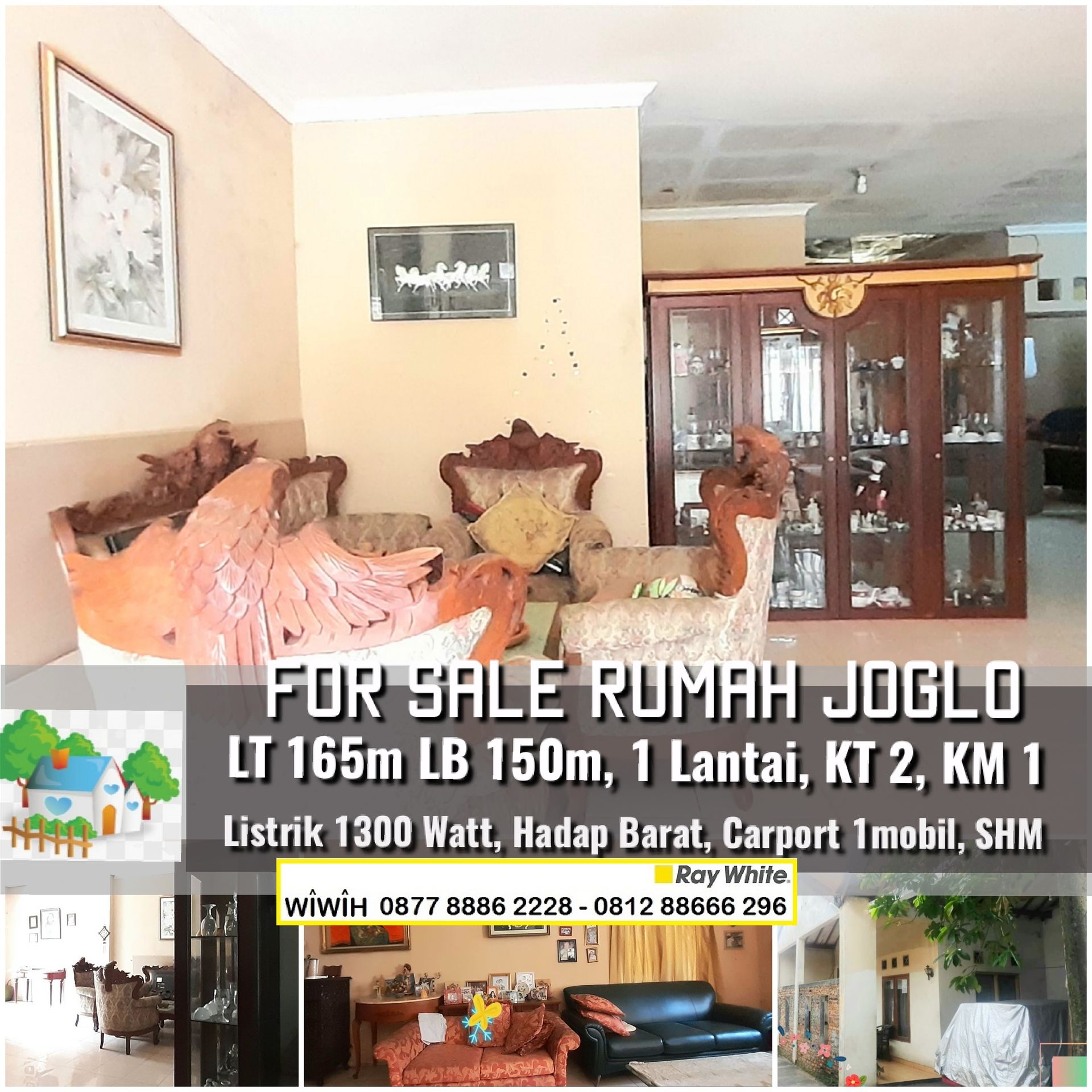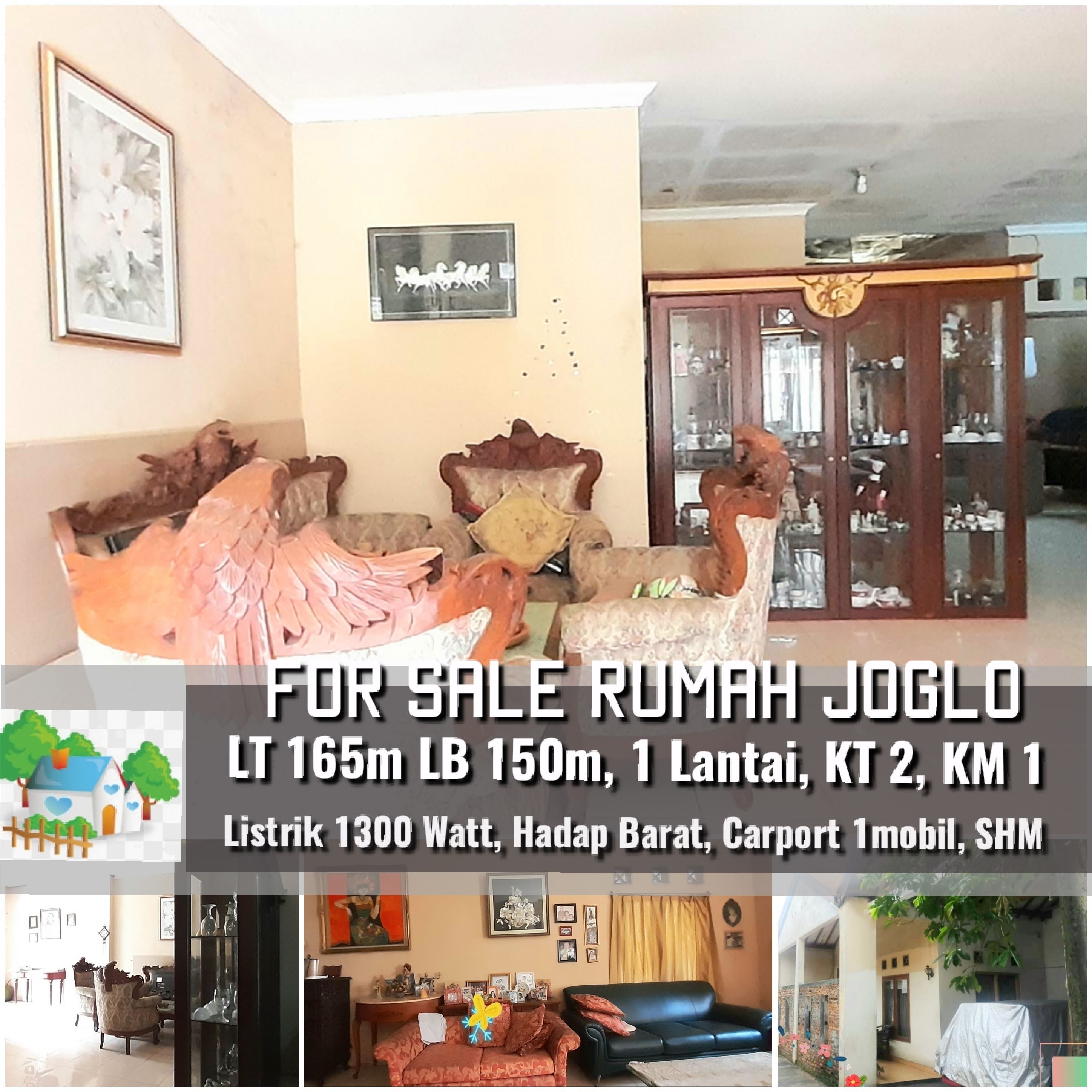 Spesifikasi : LT 165m LB 150m, 1 Lantai, KT2, KM1, Listrik 1300 Watt, Carport 1 Mobil, Air Sumur, Hadap Barat, surat sertifikat SHM