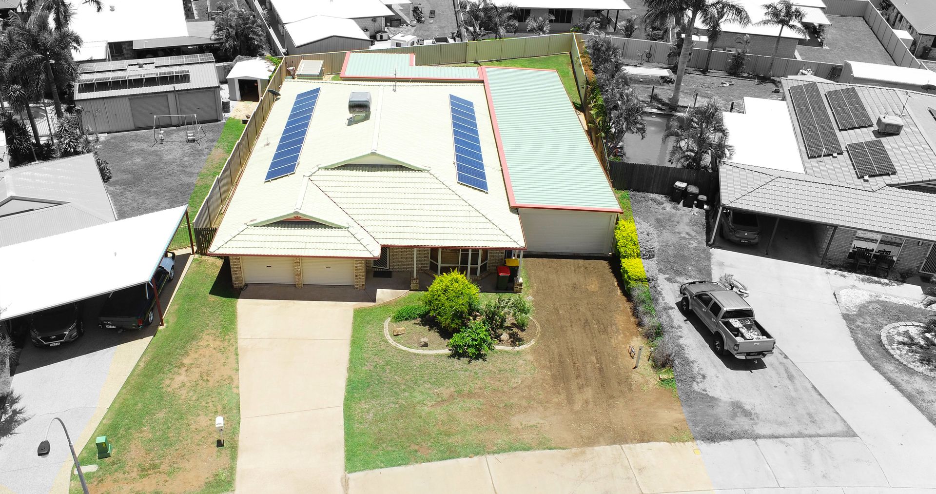 - Huge covered outdoor entertainment area with insulated roof, projector & screen which can also be utilised for extra car parking plus remote door
