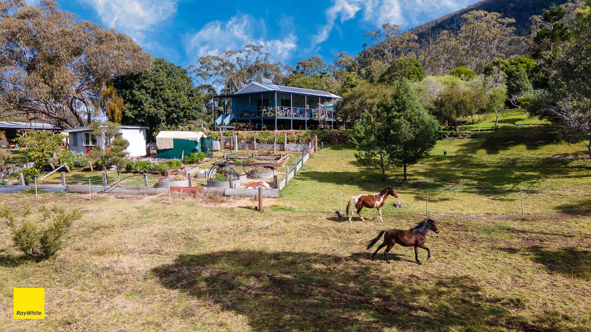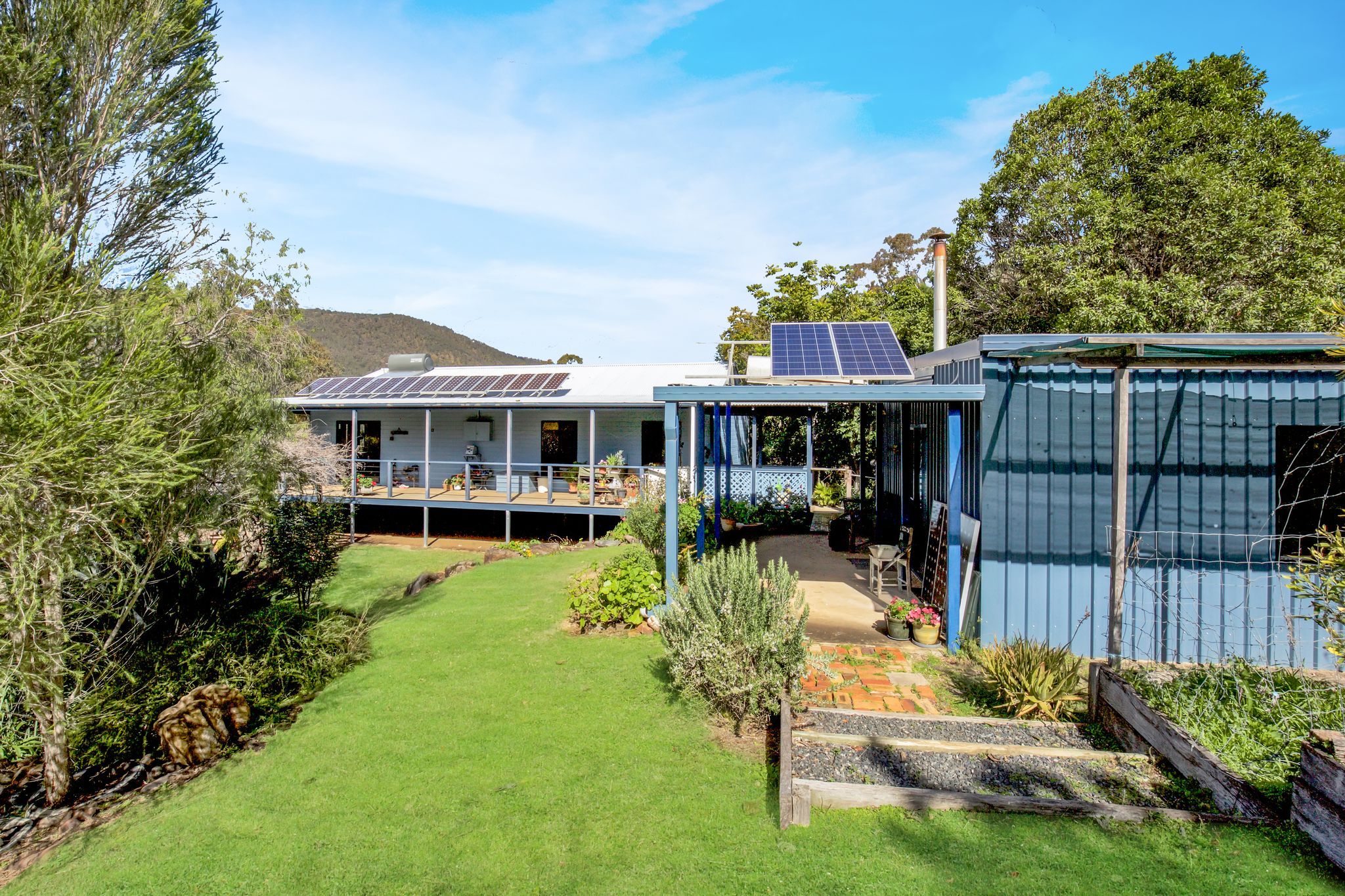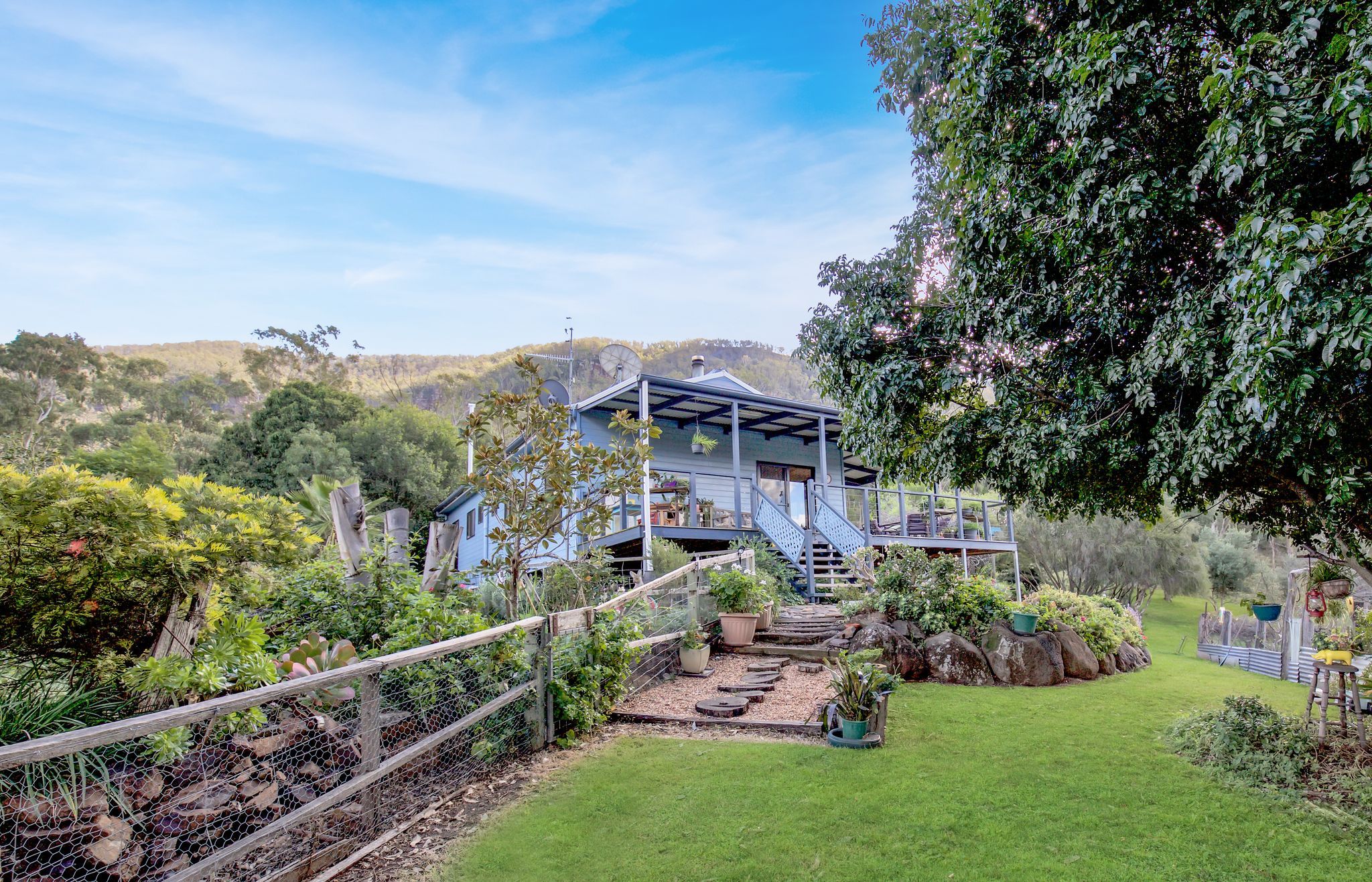 Spectacular elevated views of the mountain ranges can be seen from the 2 bedroom home. Situated amongst beautiful established gardens, fruit trees and stunning rock retaining walls.