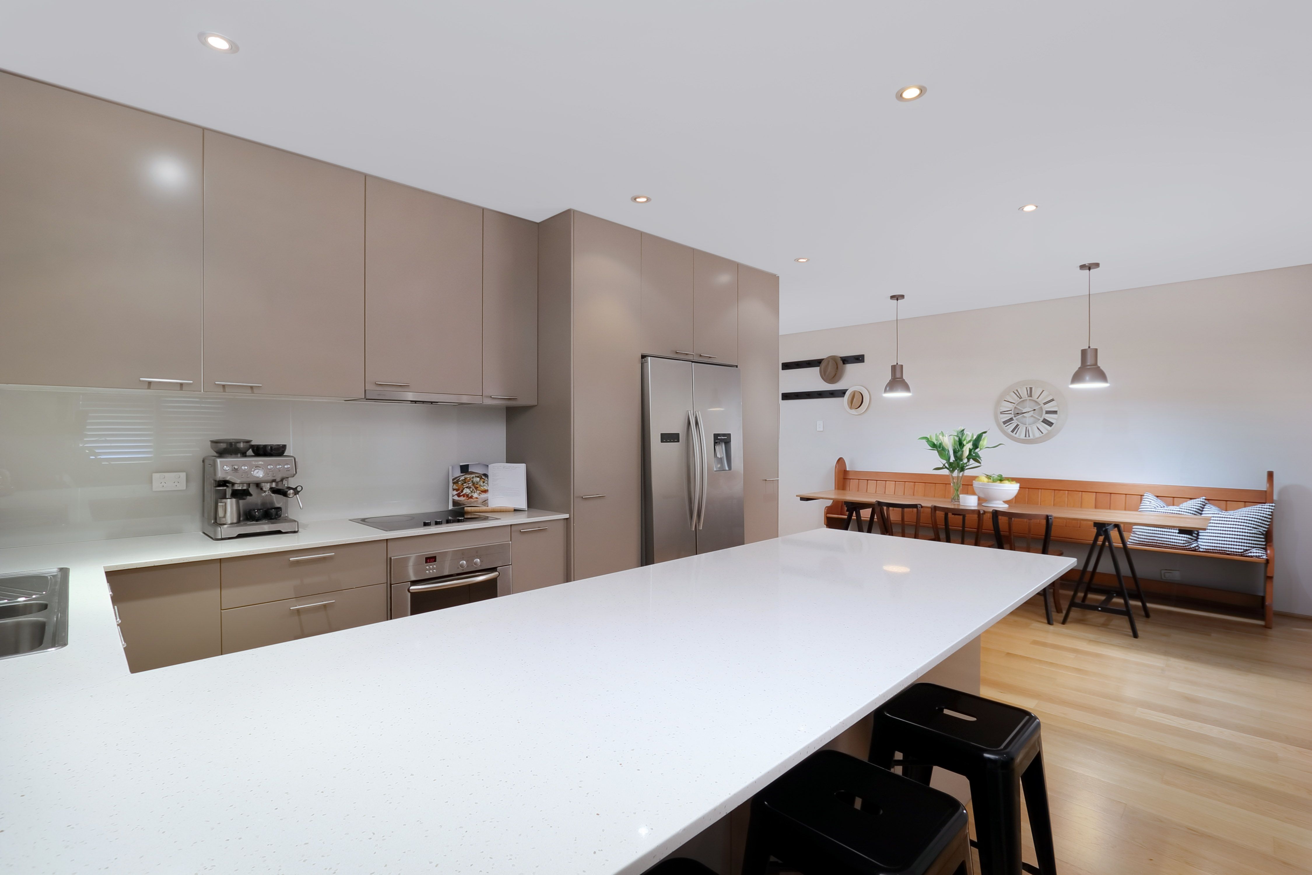 - Stylish kitchen with breakfast bar, dishwasher and stone benchtops