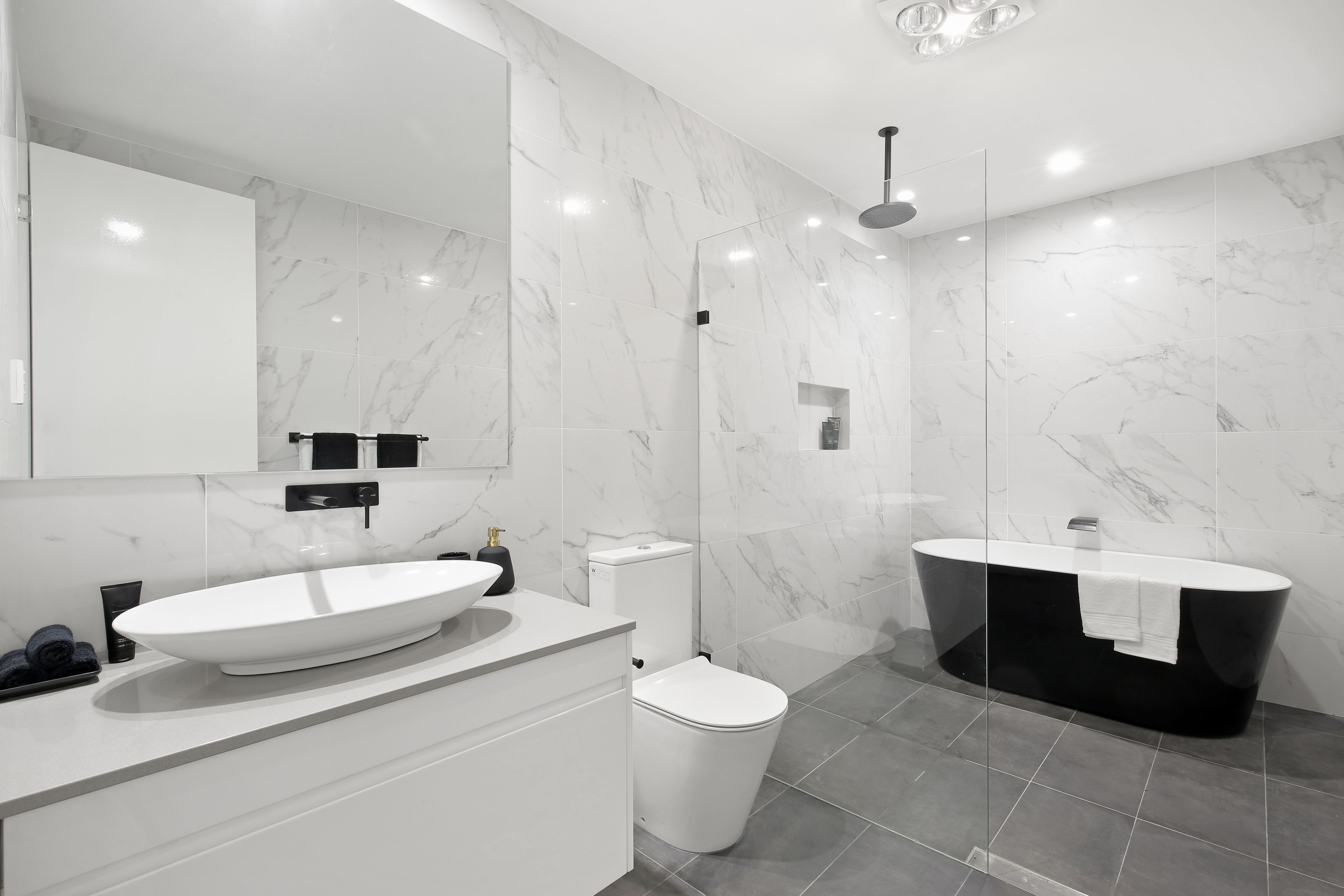 * Main bathroom with freestanding bath, built-in robes