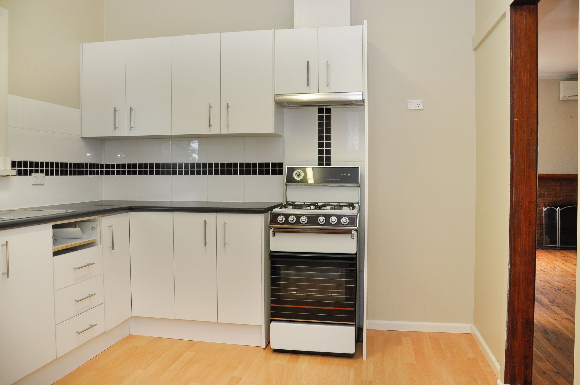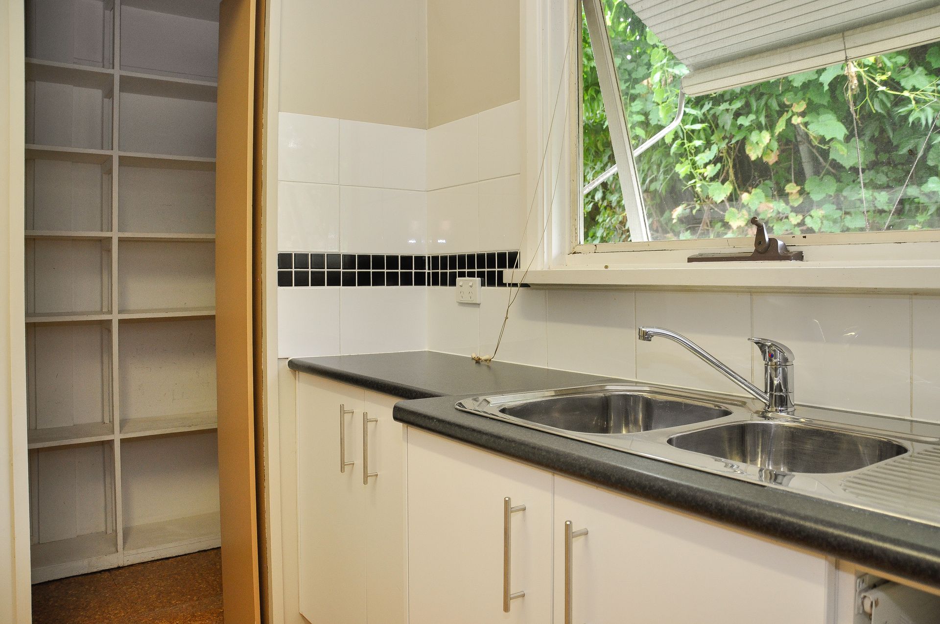 Refurbished kitchen equipped with gas cooking and large walk in pantry.