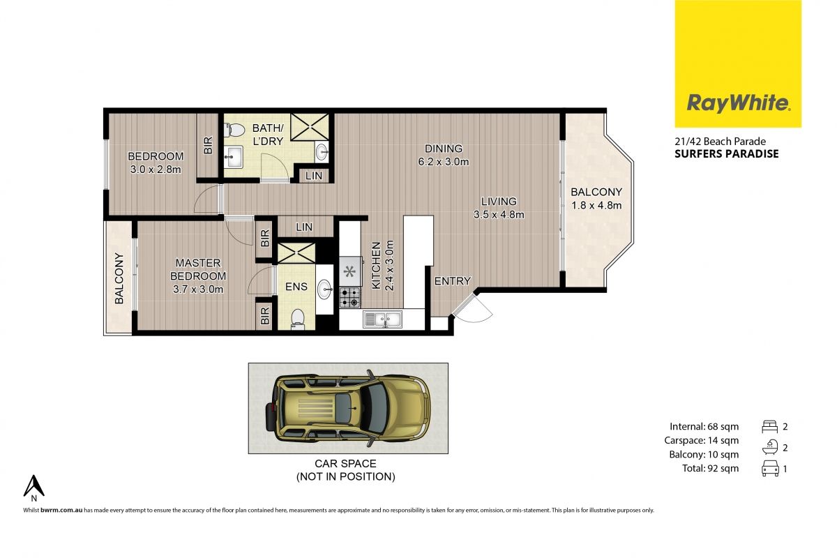 Two bedrooms both air conditioned the main with ensuite, large open plan living area opening to a north east facing balcony.