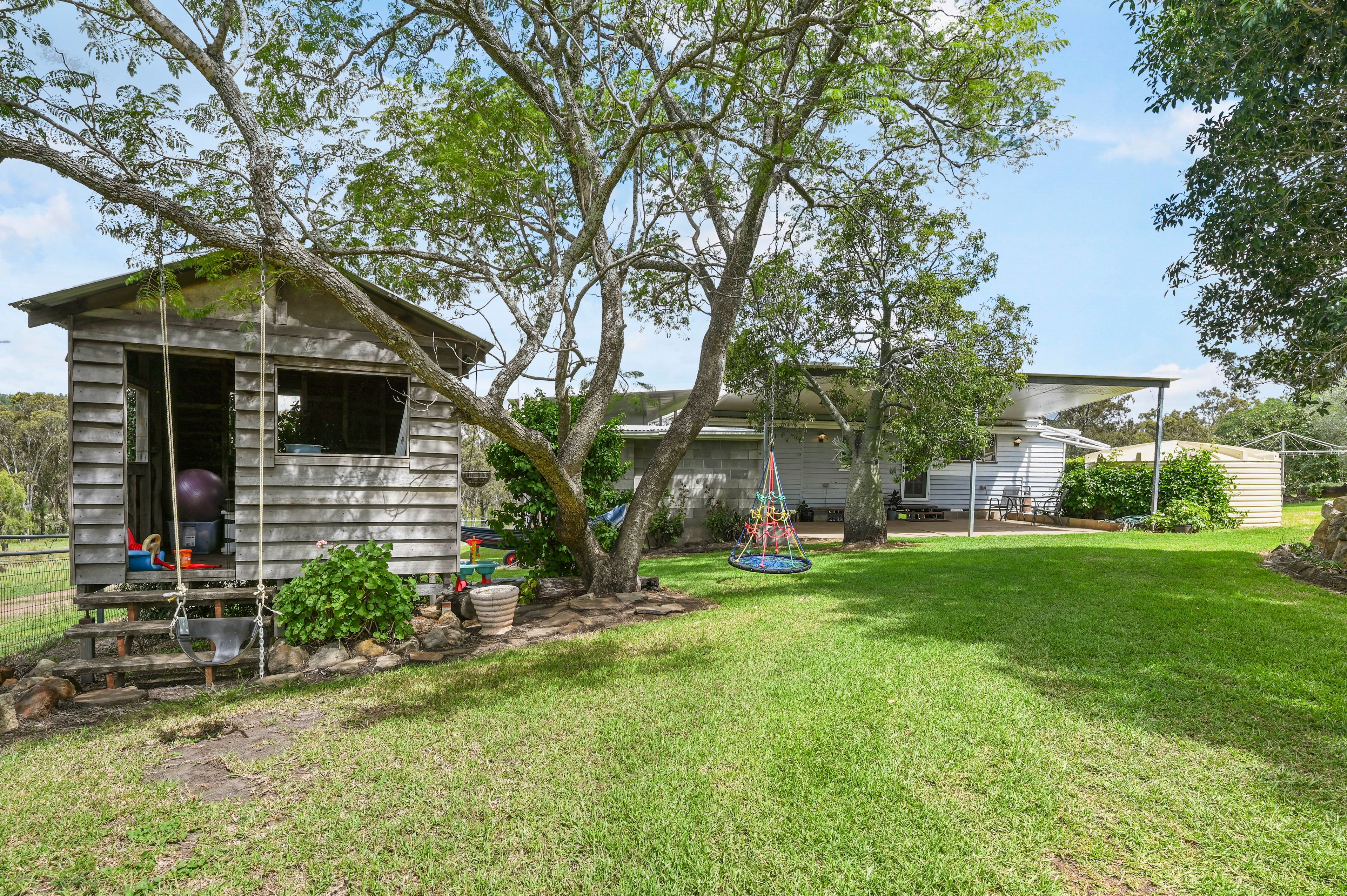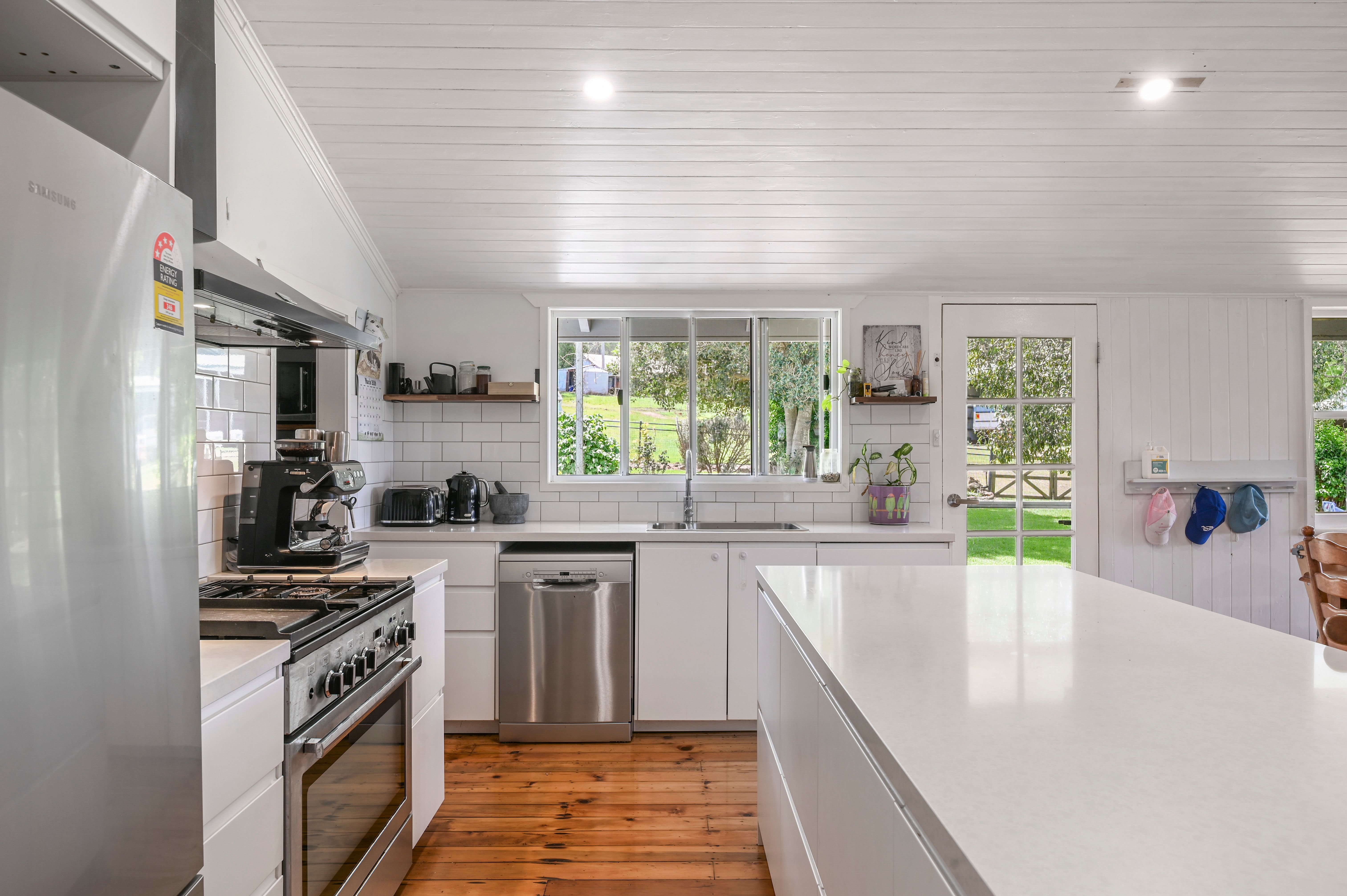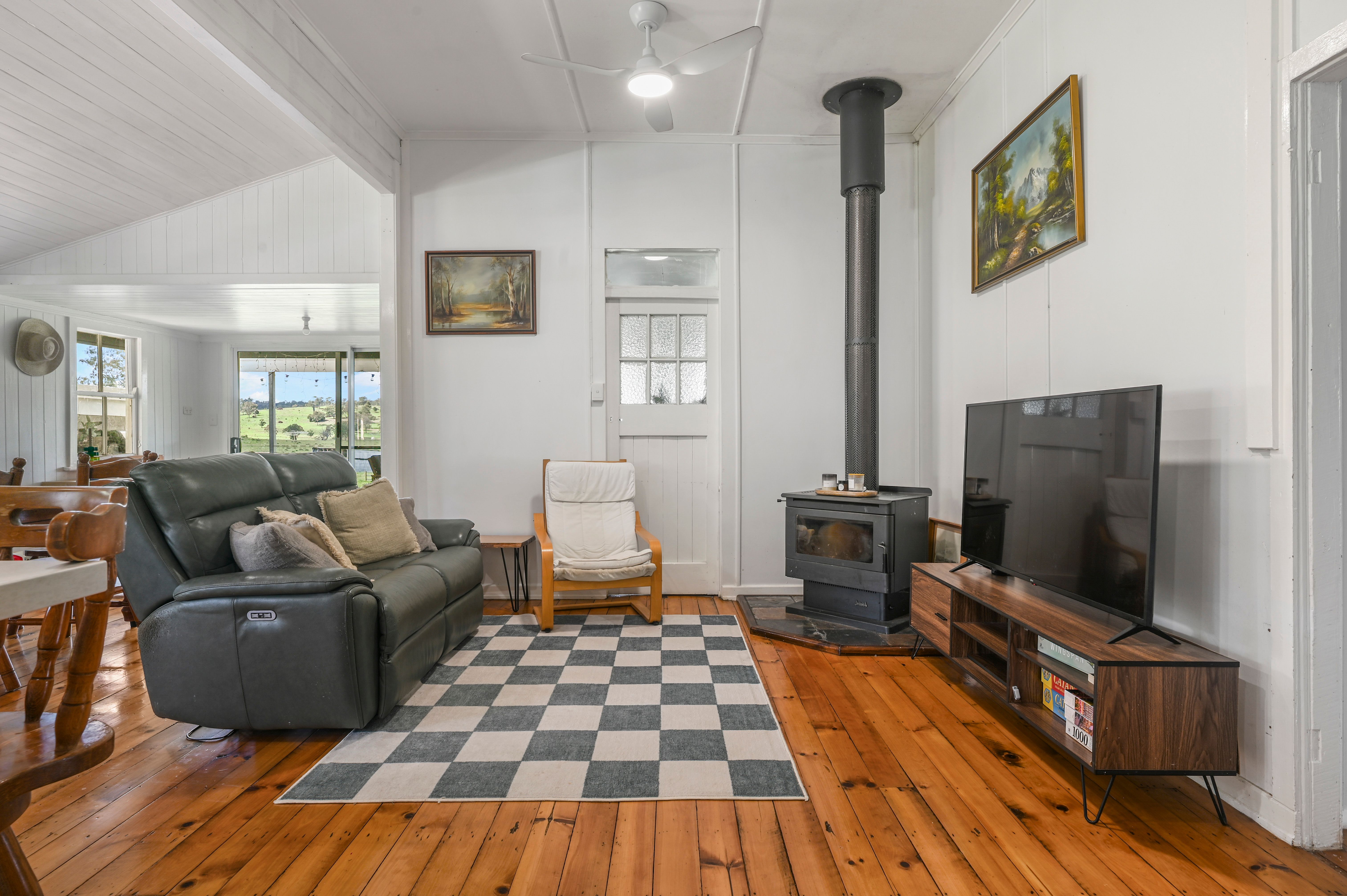 The residence offers the perfect blend of comfort and rural charm. Designed for relaxed country living, the home features a stunning chef's kitchen at its heart, flowing seamlessly into the open-plan living and dining area and out to an elevated timber deck capturing breathtaking views across the landscape. Established gardens, an orchard, and veggie patch complete the lifestyle appeal.