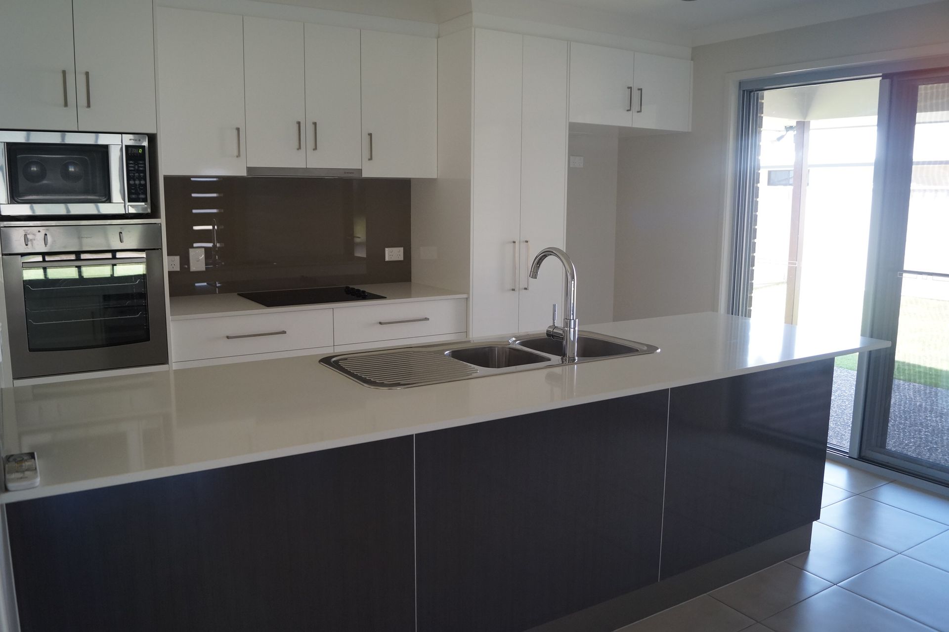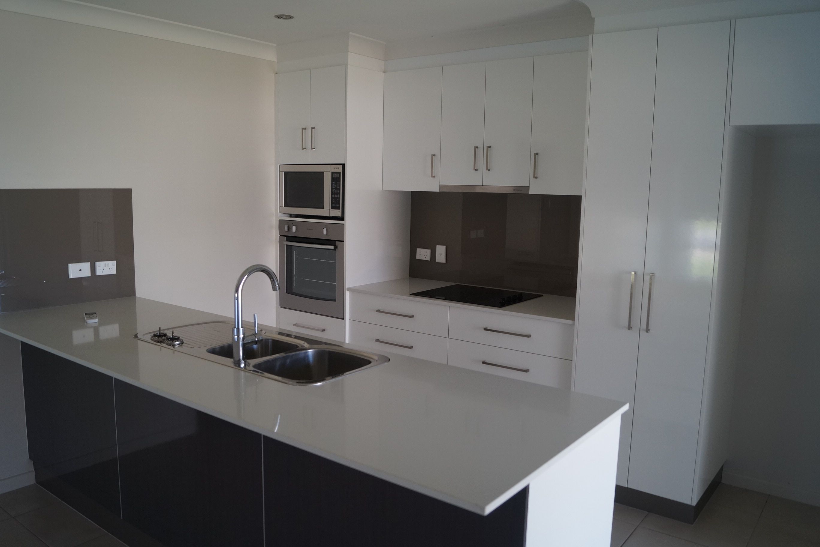 - Modern style kitchen includes a dishwasher, microwave and stone benchtops