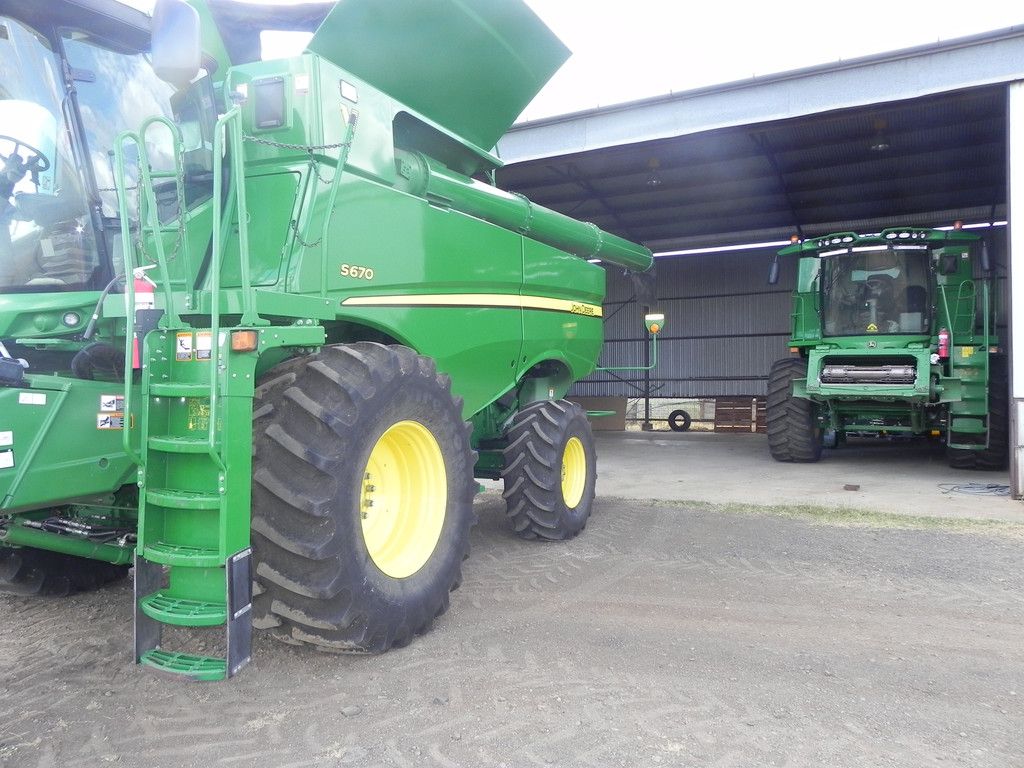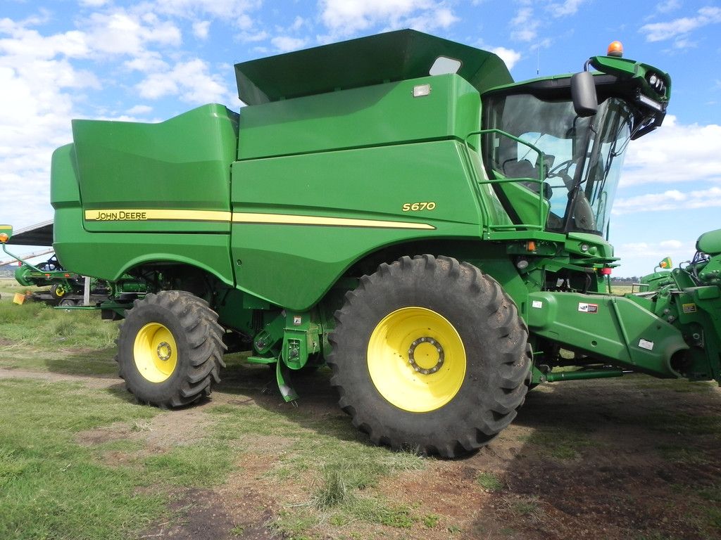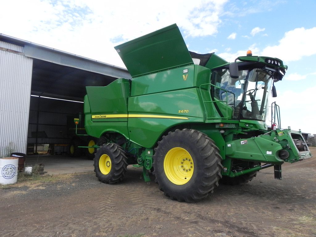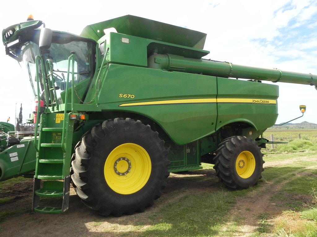 •JDeere S670 header 2015 1794 rotor 2377 eng hrs, auto steer, arm rest 2630 screen, Contour Master feeder house, Power Cast chopper, hyd fold bin lids, HRU auger, tyres as above