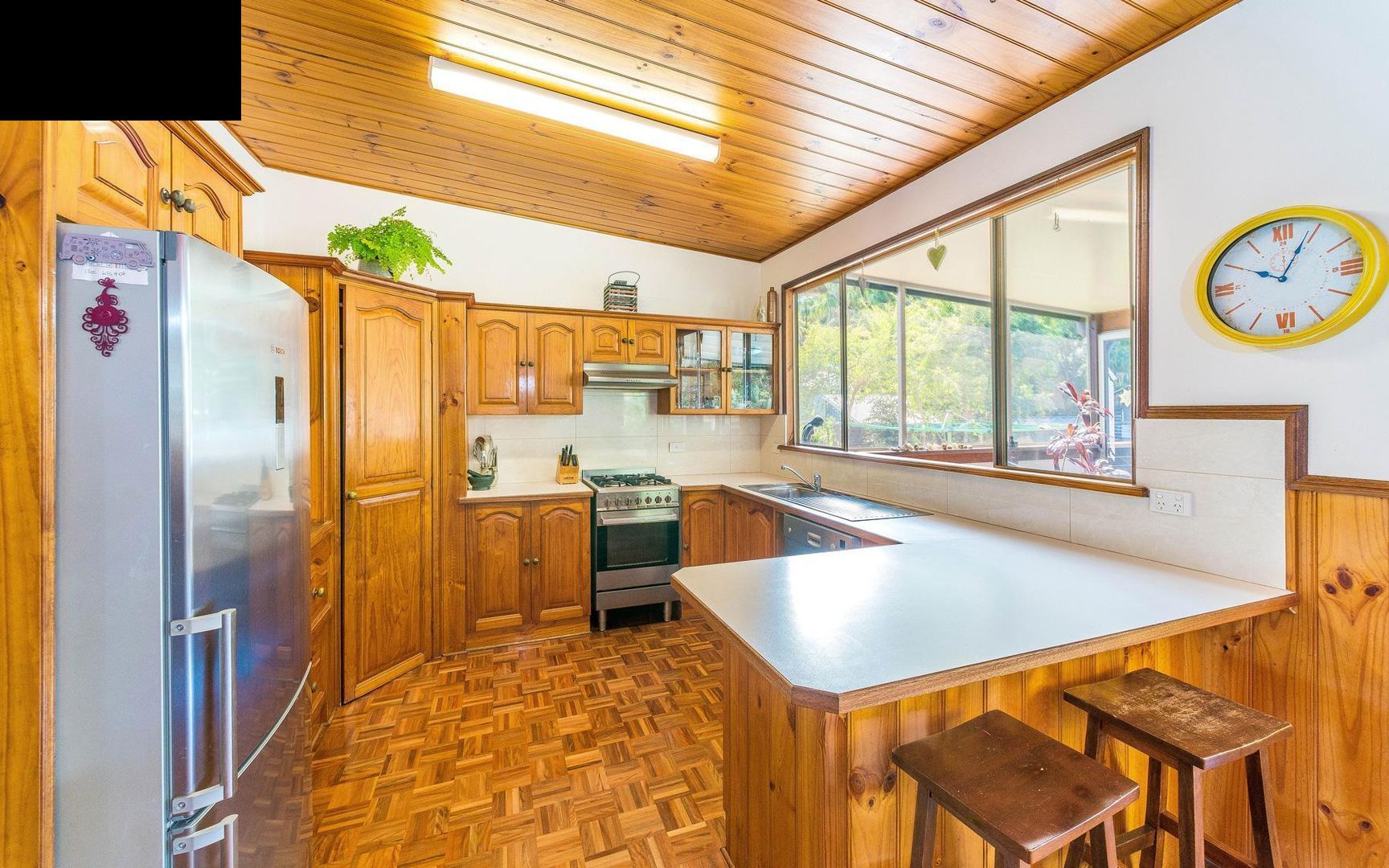• timber kitchen with gas cooktop and stainless steel dishwasher.