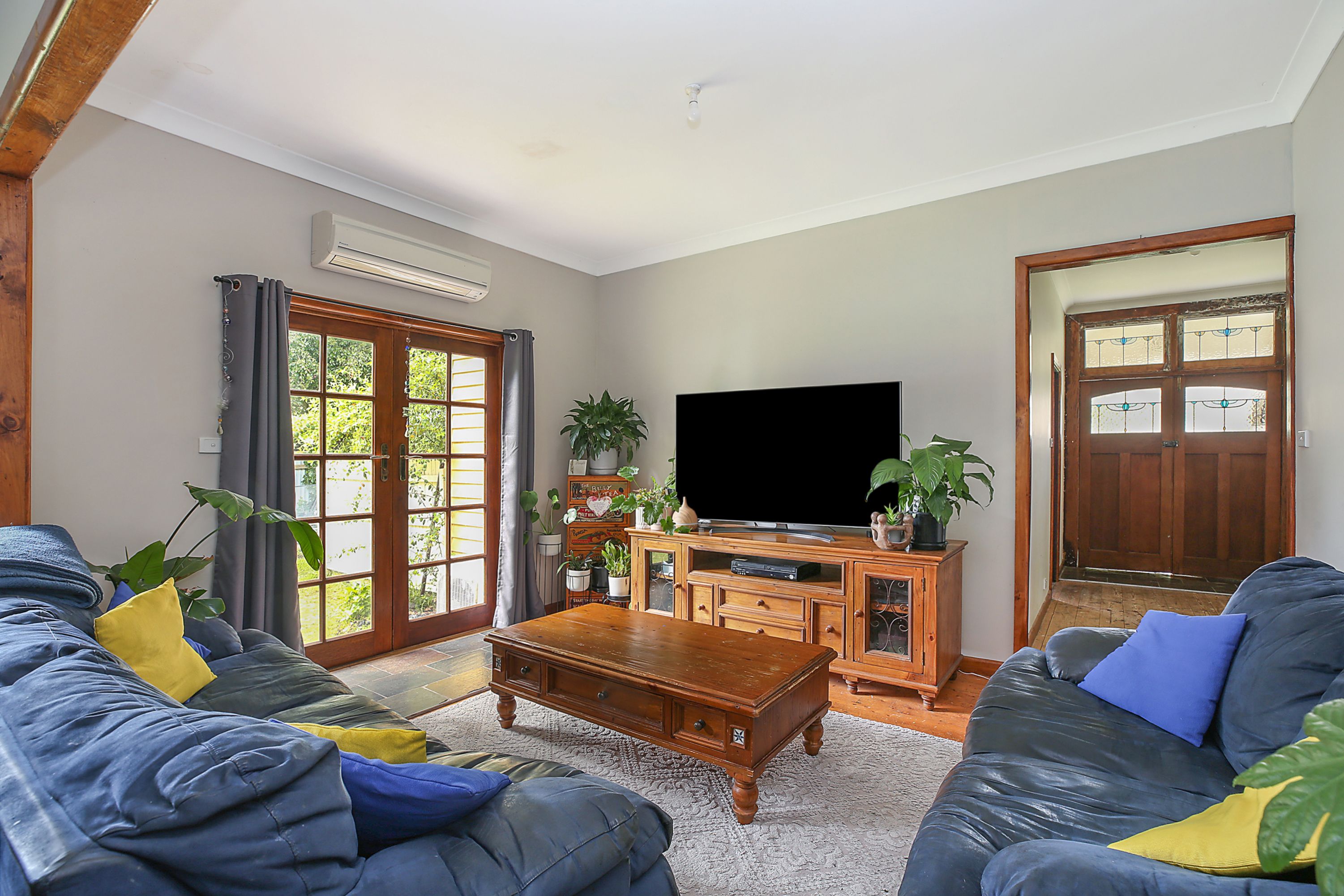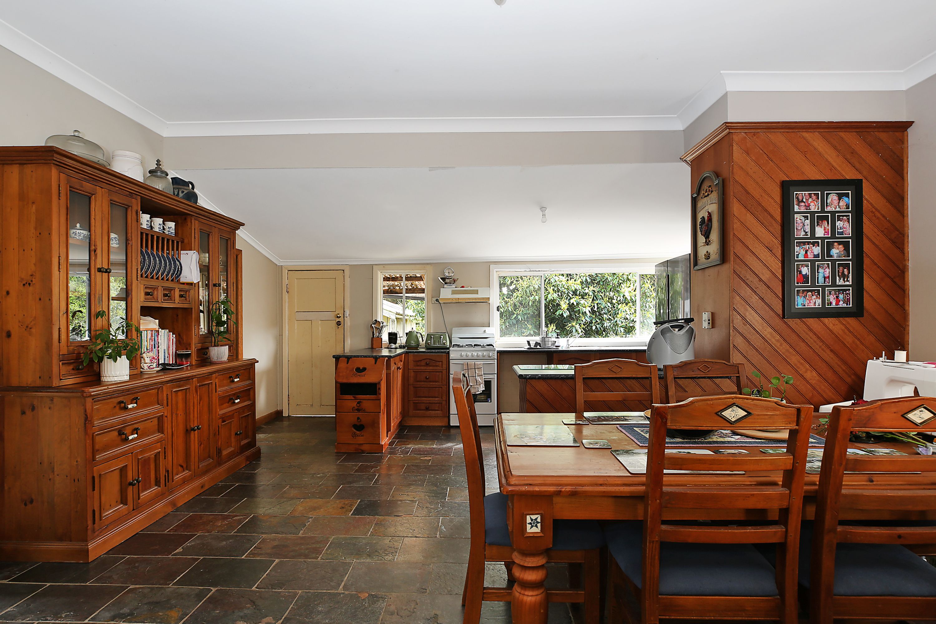 A large entry hall off the front veranda welcomes you to 3 large bedrooms, all with timber floorboards and large windows allowing plenty of natural light to accentuate the space. A generous open-plan kitchen combines slate flooring with timber cabinetry embracing a homely country feel. There's plenty of room for the whole family in the adjoining dining area and lounge room, with a gas log fire as the focal point, sure to bring everyone together for Sunday roast or games night. The practical bathroom features sleek white tiles, a separate bathtub and shower along with a vanity and toilet. Leadlight doors and windows are featured throughout adding a touch of character and warmth to the home.