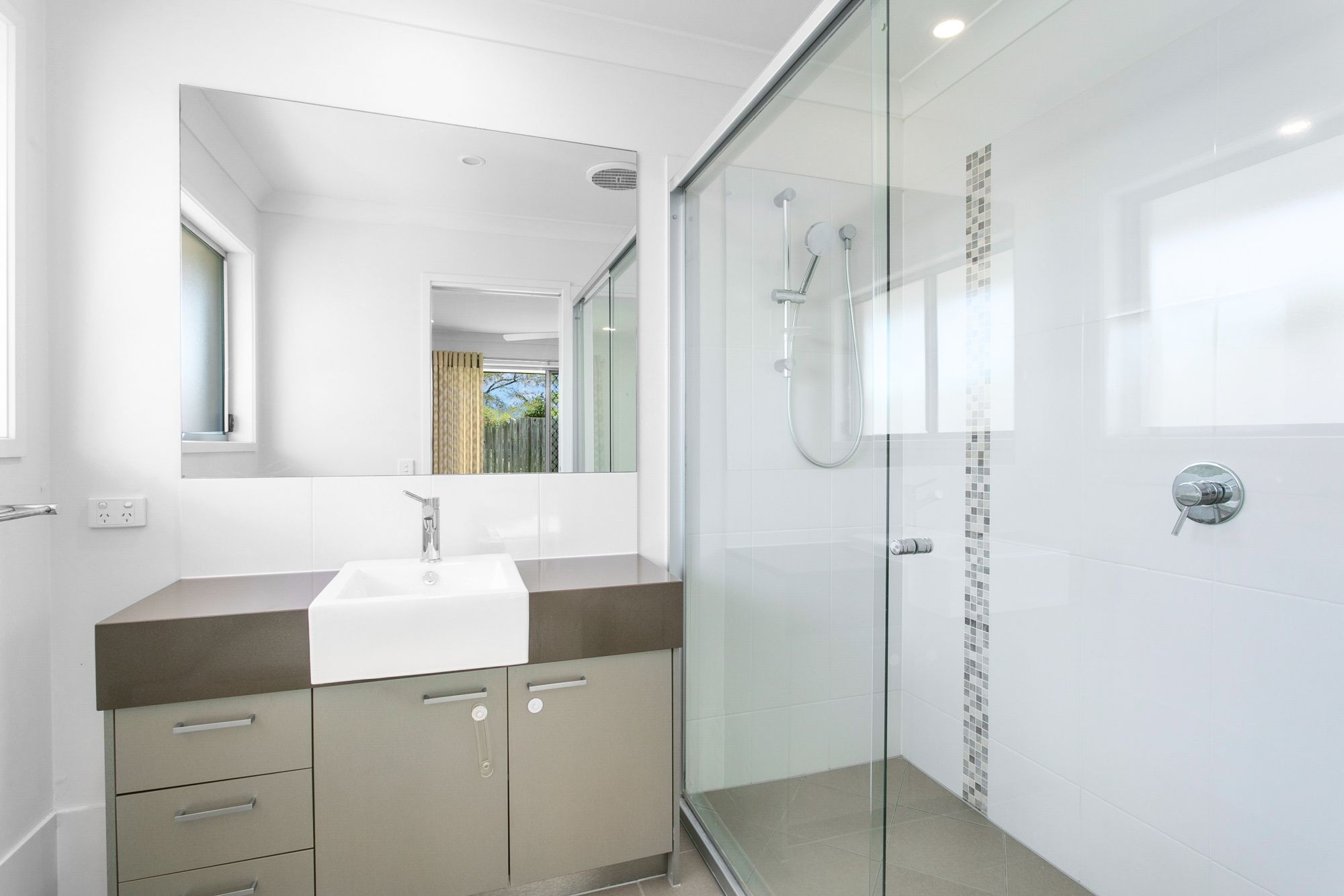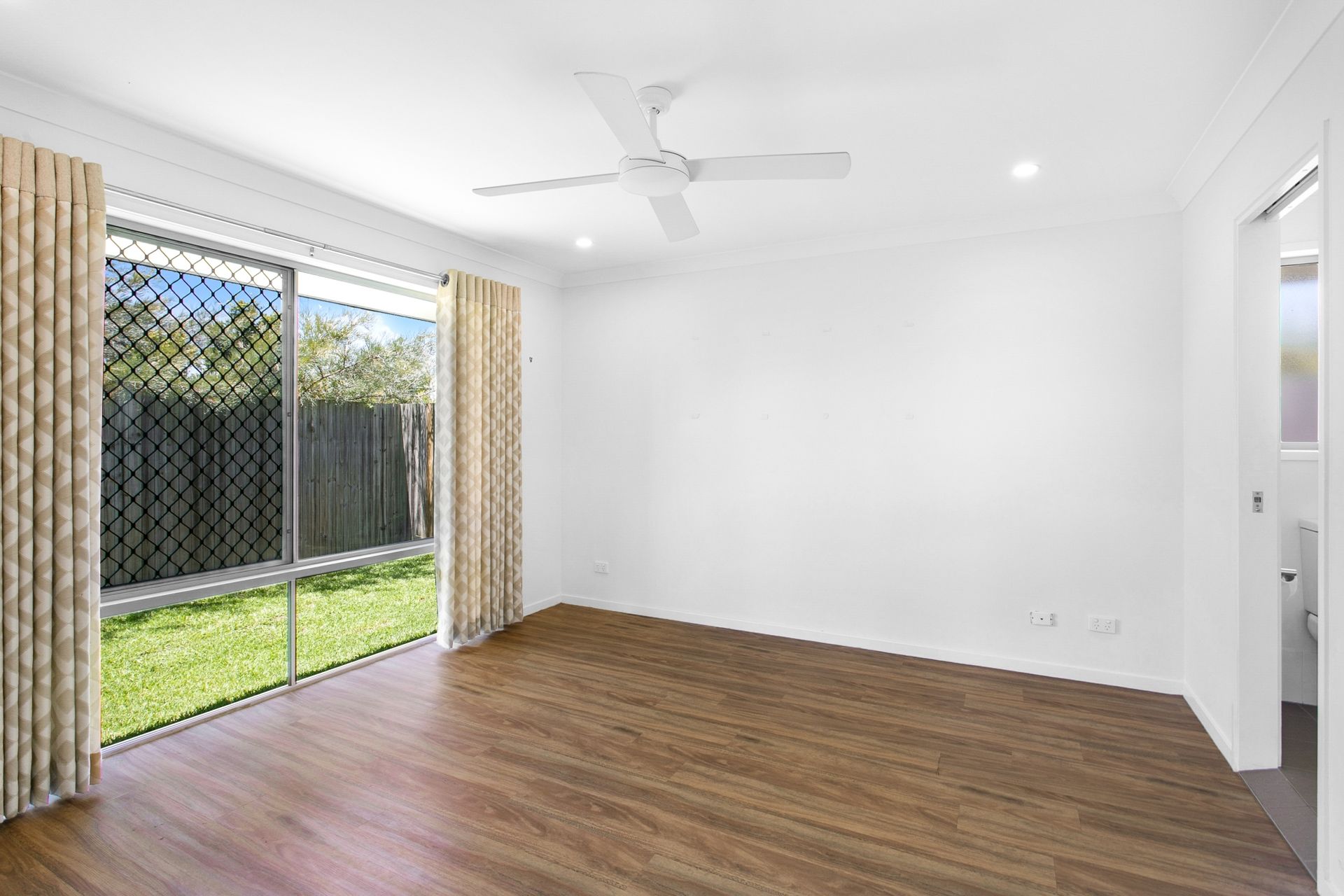 - Main bedroom with ceiling fan, large ensuite, WIR with shelving and access to the outside patio