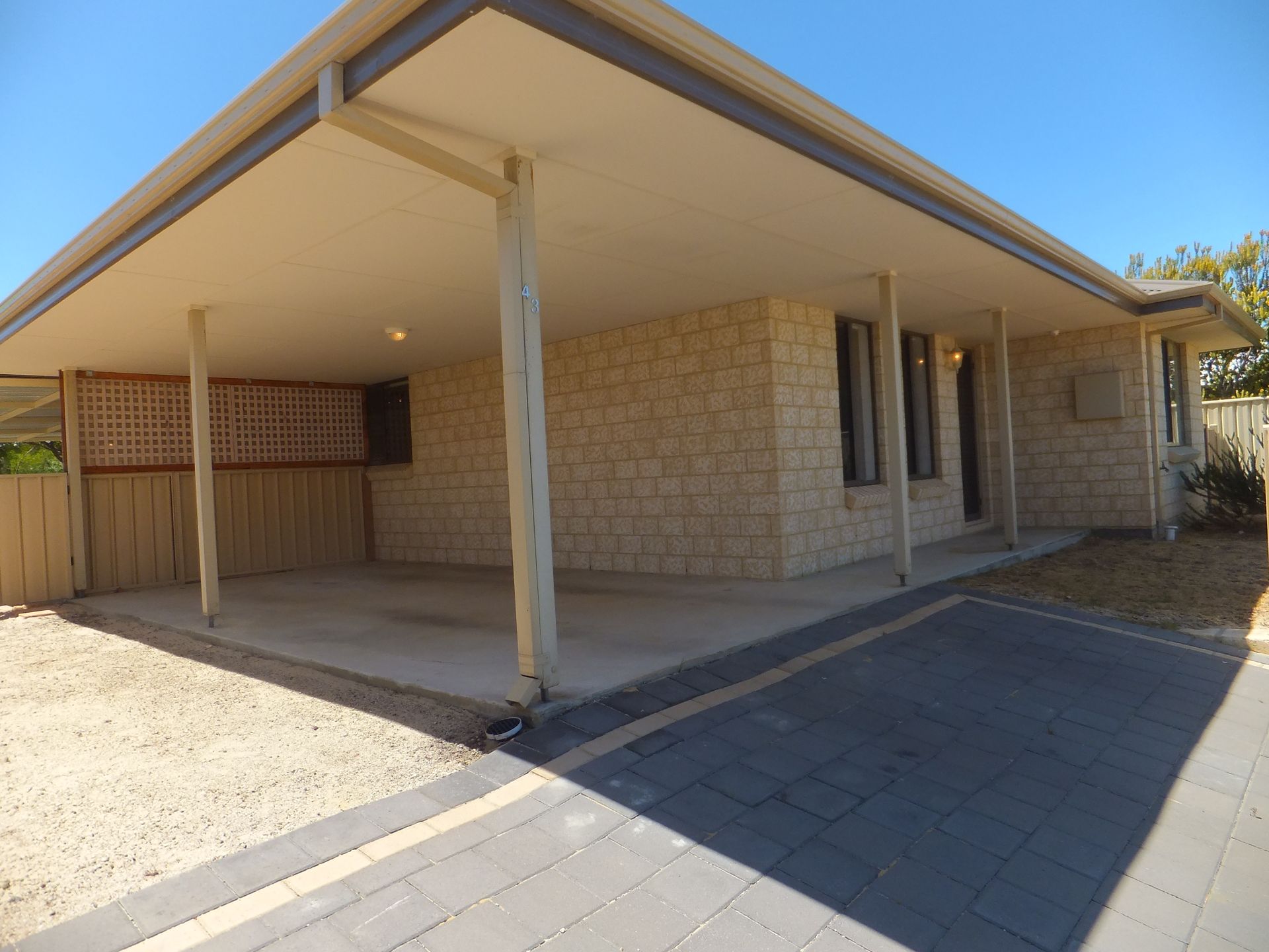 Modern brick home with open carport and extra space for another vehicle.